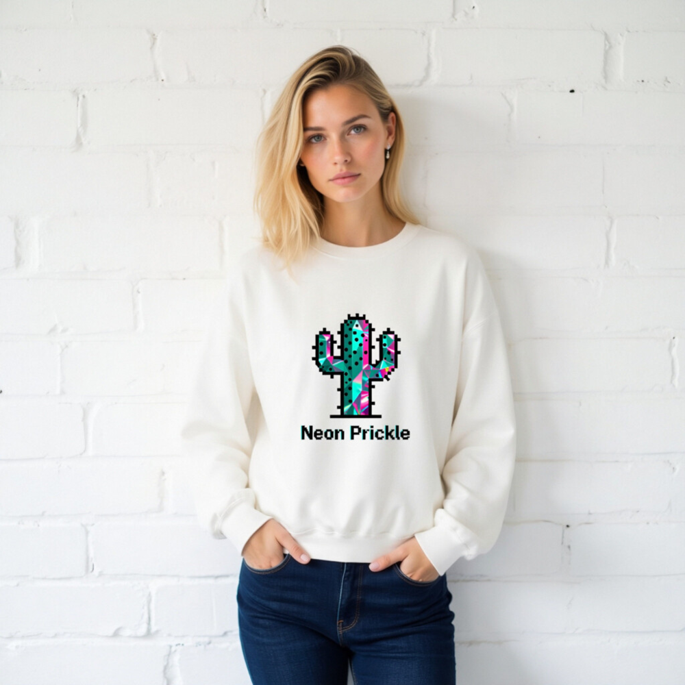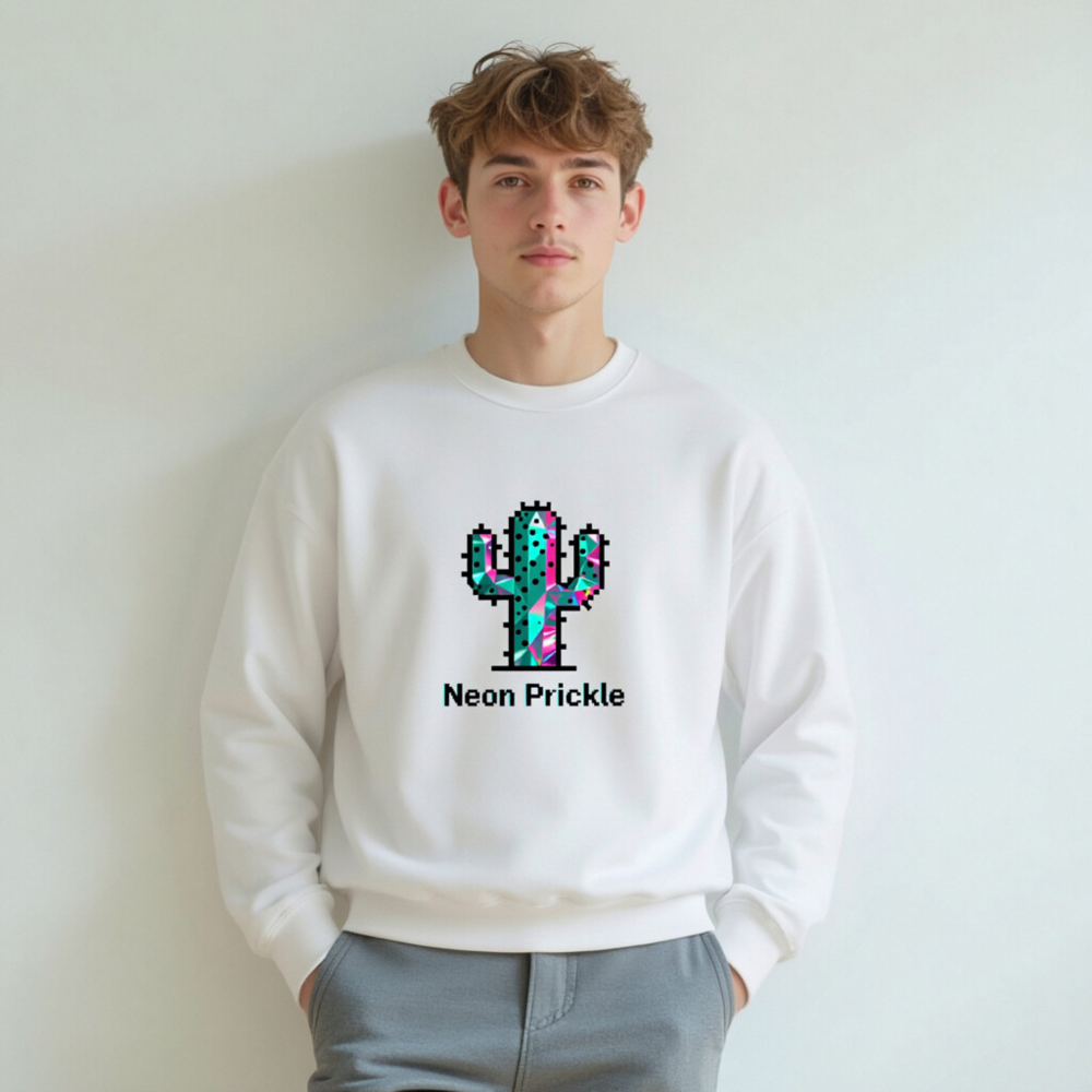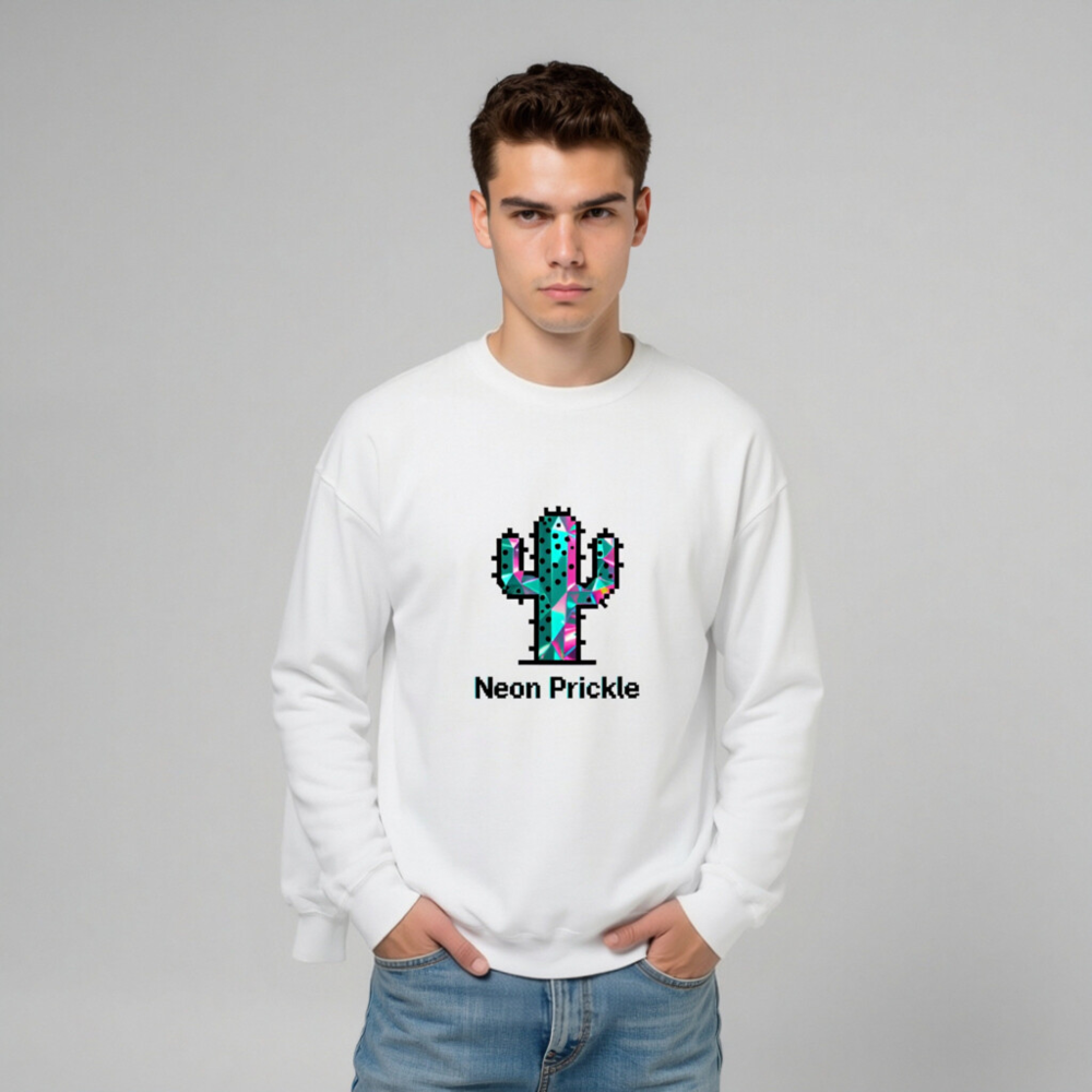 Showcase bold desert vibes with this unisex crew neck sweatshirt featuring a striking pixel-art cactus in neon teal, pink, and magenta. The vibrant geometric ‘Neon Prickle’ design stands out on premium soft cotton blend fabric. Perfect for casual wear, festivals, or everyday style—unisex fit, comfortable, and eye-catching. Ideal for cactus lovers and fans of retro-futuristic art.
