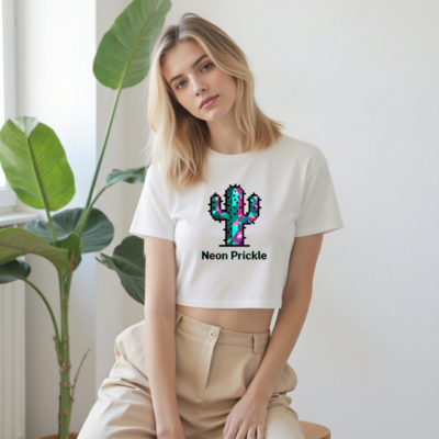 Showcase your bold style with this women’s crop top featuring a vibrant pixel-art cactus in neon teal, pink, and magenta. Designed for comfort and flair, the short-sleeve, high-low hem crop top pairs perfectly with jeans or skirts. Ideal for casual outings, festivals, or everyday wear. Soft cotton blend, machine washable. Get the ‘Neon Prickle’ look—fun, eye-catching, and uniquely yours.