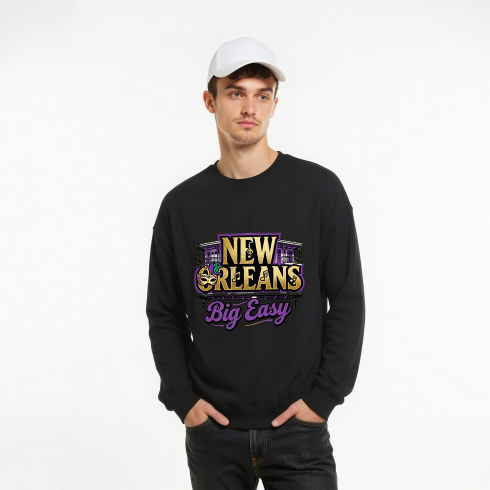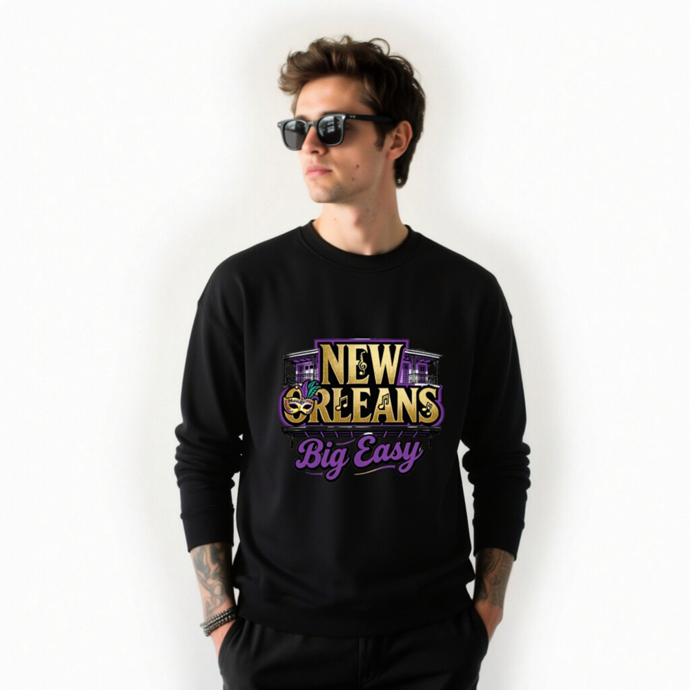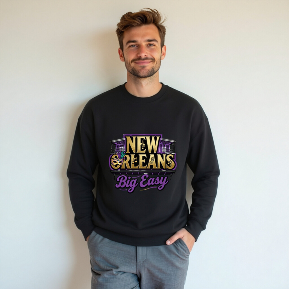 Show your love for the Big Easy with this unisex crew neck sweatshirt featuring authentic New Orleans motifs: iconic wrought-iron balconies, a Mardi Gras mask with purple/gold feathers, musical notes, and bold ‘NEW ORLEANS’ text. Designed for comfort and style, it captures the city’s vibrant spirit in gold, purple, and black—perfect for fans of jazz, festivals, and Southern charm.