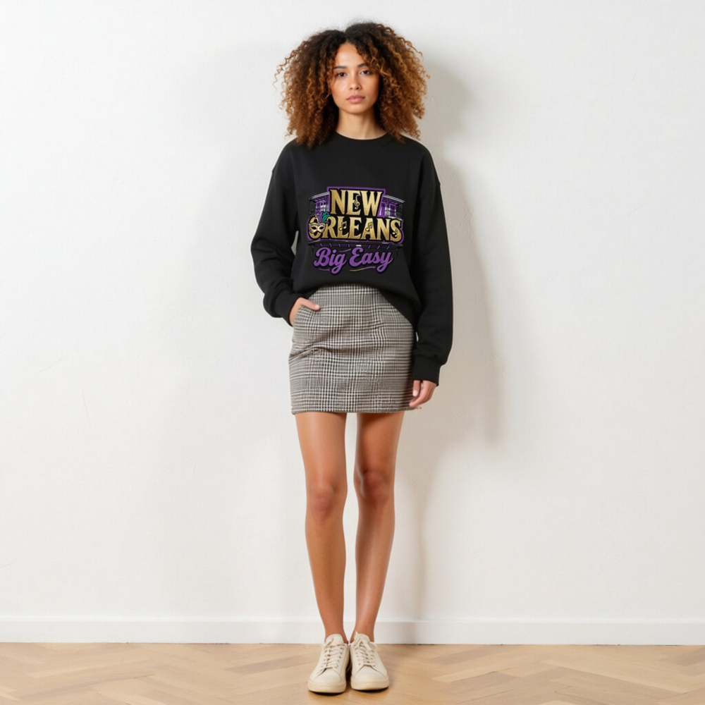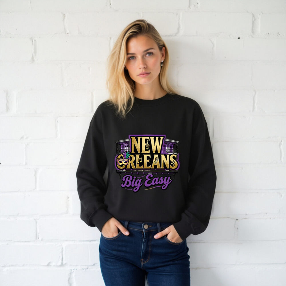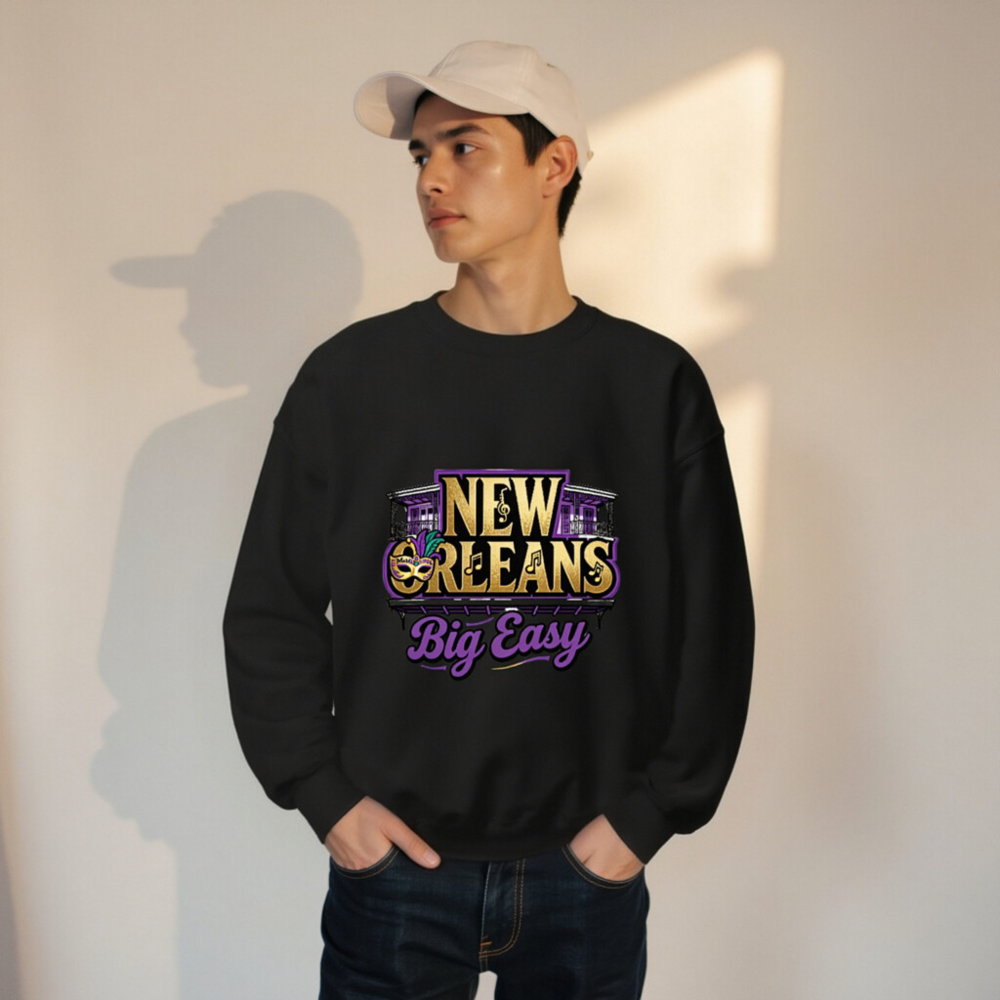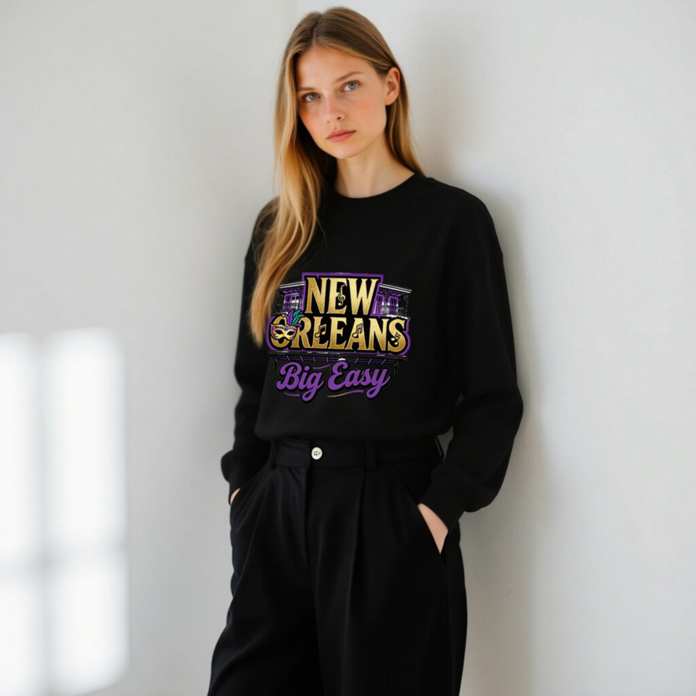 Show your love for the Big Easy with this unisex crew neck sweatshirt featuring authentic New Orleans motifs: iconic wrought-iron balconies, a Mardi Gras mask with purple/gold feathers, musical notes, and bold ‘NEW ORLEANS’ text. Designed for comfort and style, it captures the city’s vibrant spirit in gold, purple, and black—perfect for fans of jazz, festivals, and Southern charm.