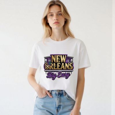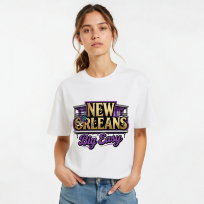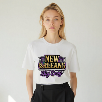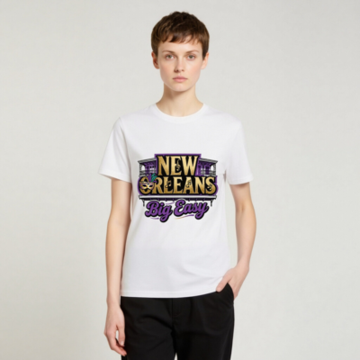 Celebrate the spirit of New Orleans with this unisex organic cotton t-shirt featuring a vibrant ‘New Orleans Big Easy’ design—featuring iconic French Quarter architecture, Mardi Gras mask, and musical notes in purple, gold, and black. Soft, breathable, and eco-conscious. Perfect for locals and visitors alike.
