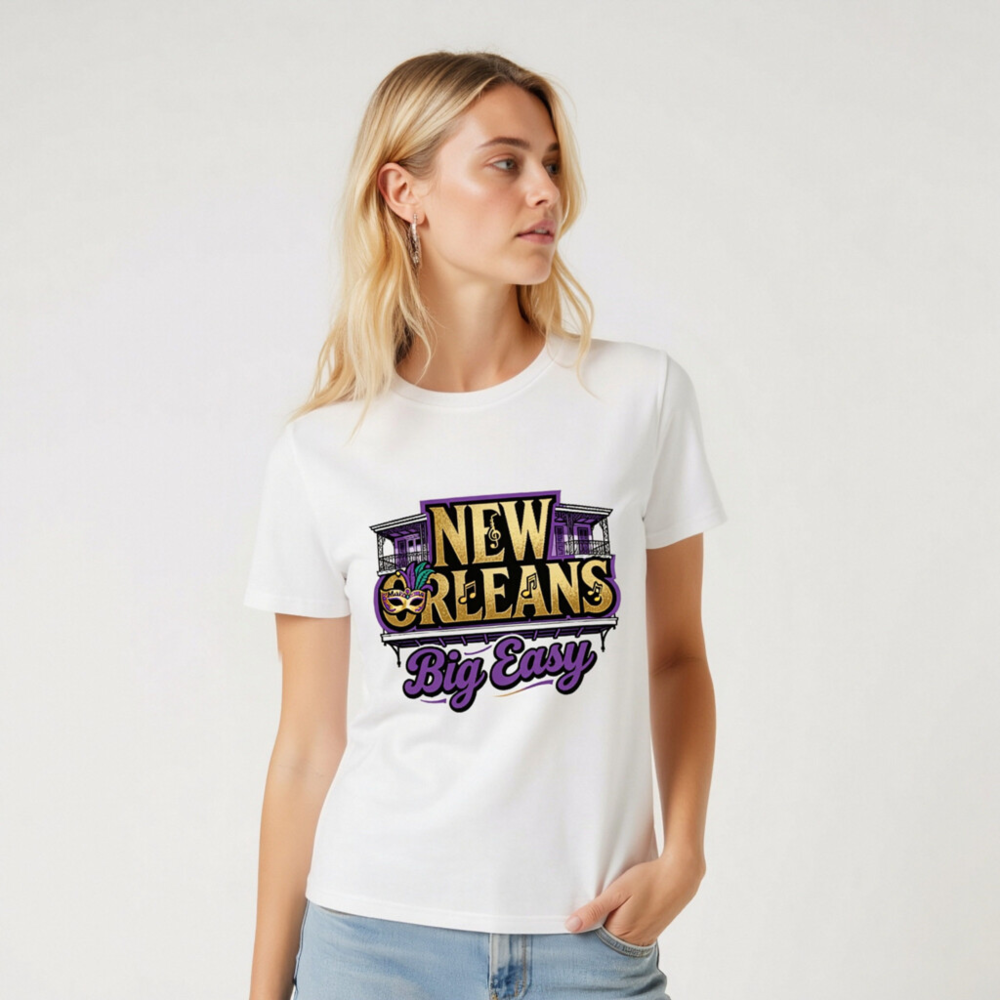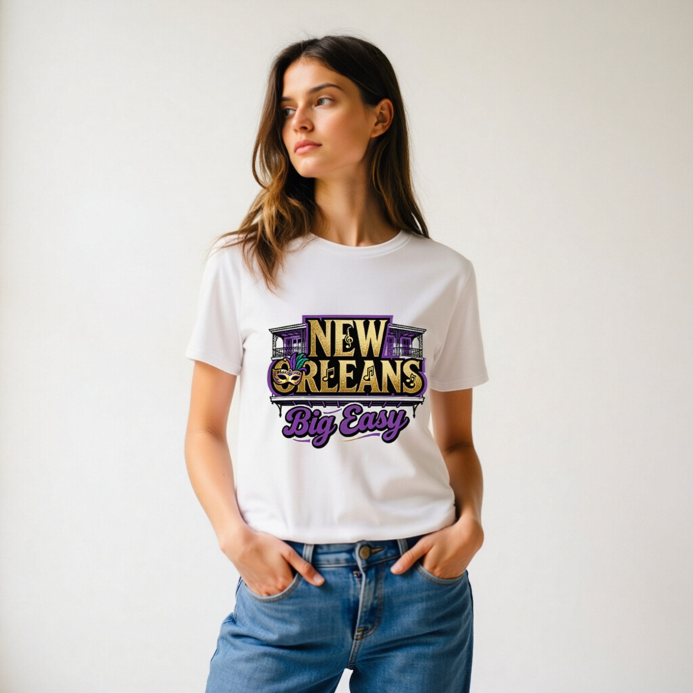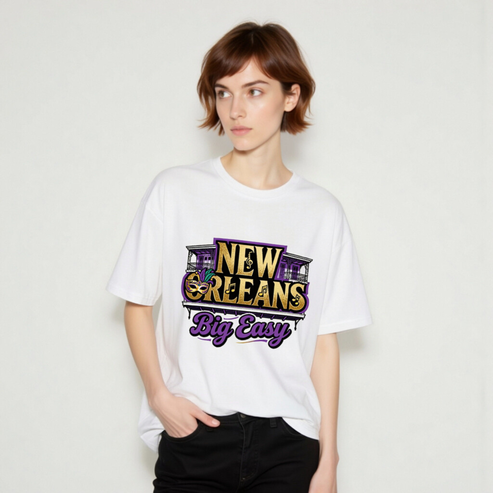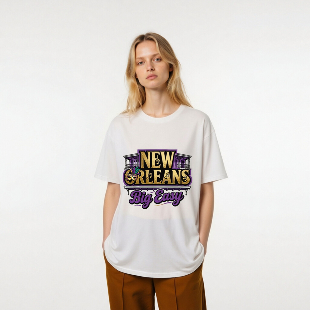 Celebrate the spirit of New Orleans with this unisex organic cotton t-shirt featuring a vibrant ‘New Orleans Big Easy’ design—featuring iconic French Quarter architecture, Mardi Gras mask, and musical notes in purple, gold, and black. Soft, breathable, and eco-conscious. Perfect for locals and visitors alike.