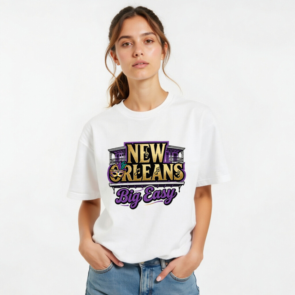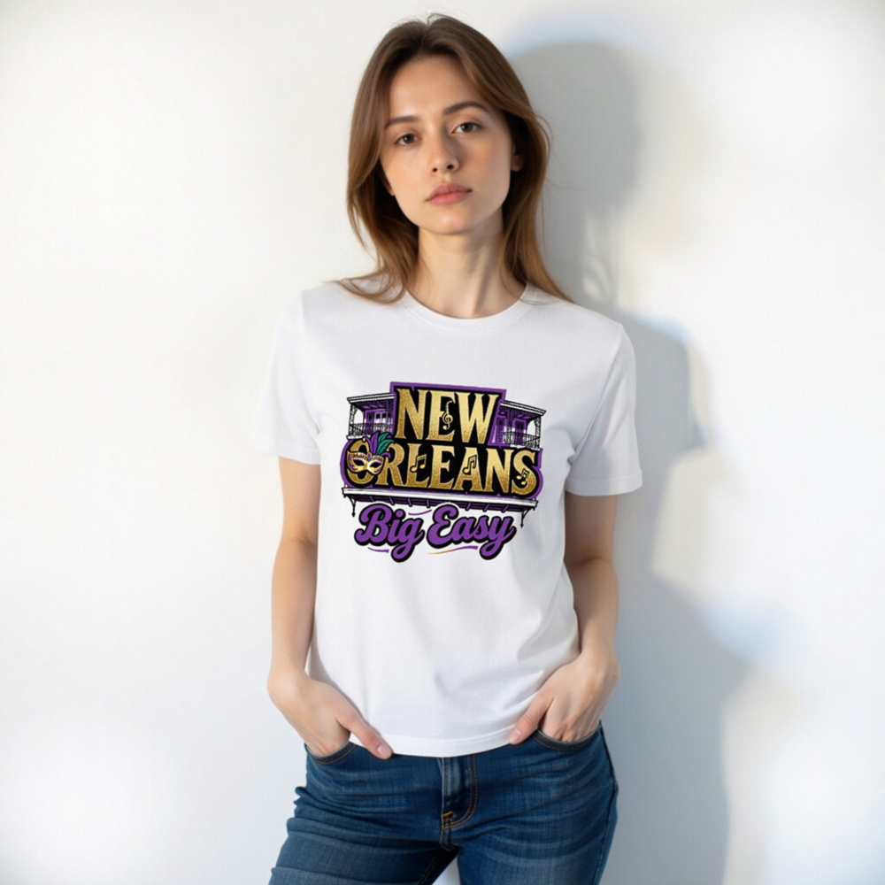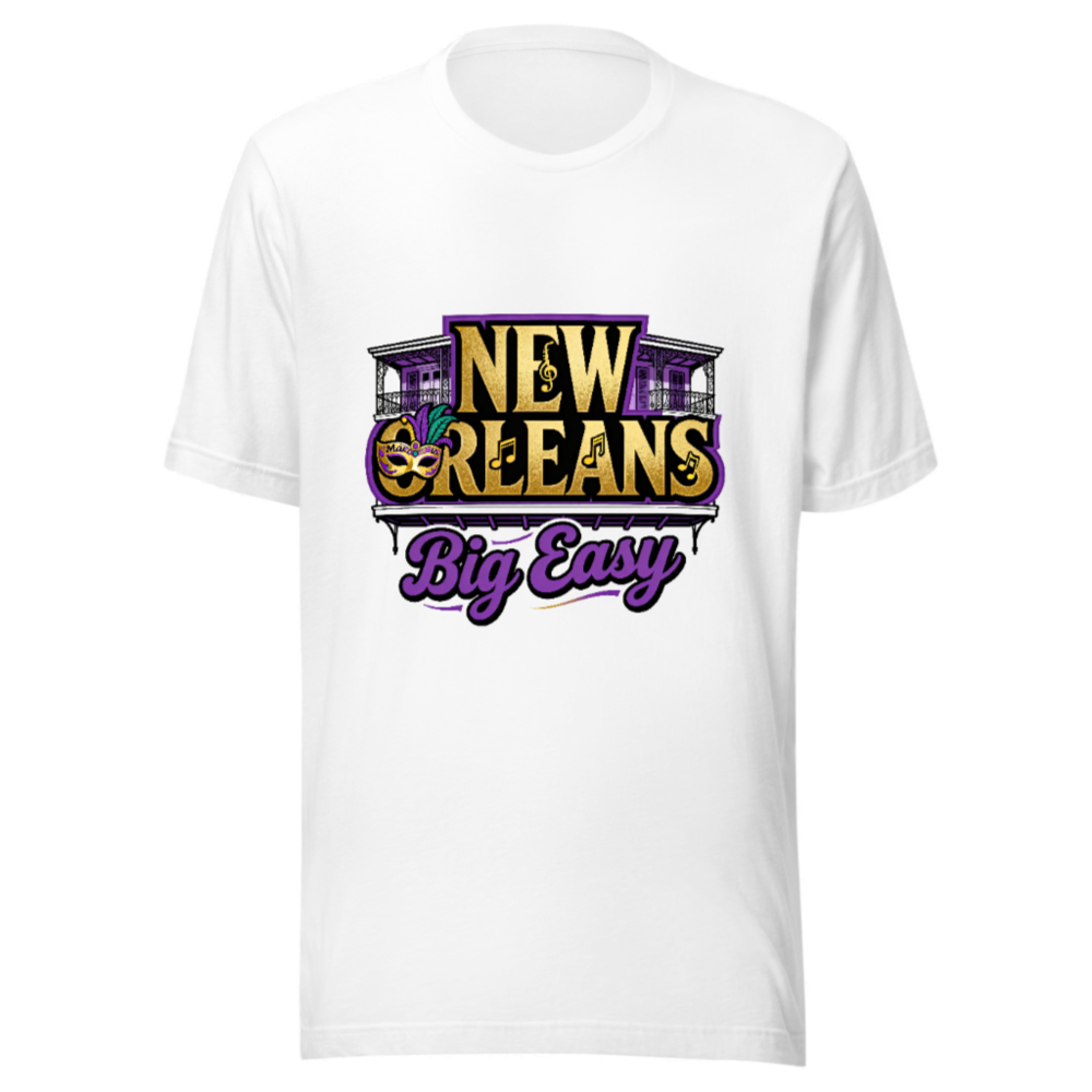Celebrate New Orleans’ vibrant spirit with this unisex staple t-shirt featuring the iconic ‘New Orleans Big Easy’ design—complete with French Quarter architecture, a Mardi Gras mask, and musical notes in gold, purple, and green. Perfect for fans of jazz, festivals, and Southern charm. Soft cotton blend, classic fit, ideal for everyday wear or as a souvenir.