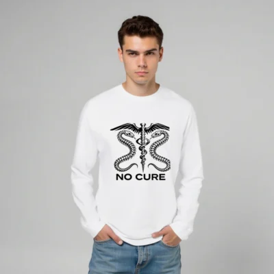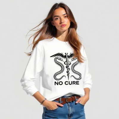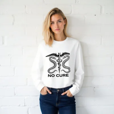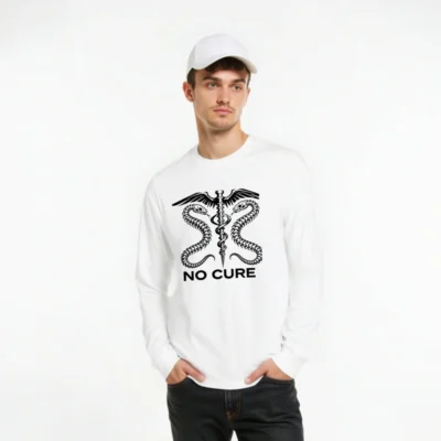 This unisex long sleeve tee features a bold black caduceus design with two coiled snakes and wings, centered above the impactful phrase ‘NO CURE’. The medical-themed graphic combines classic symbolism with modern typography for a striking statement piece. Ideal for healthcare professionals, students, or anyone who appreciates symbolic apparel. Soft cotton blend, comfortable fit, and durable print.