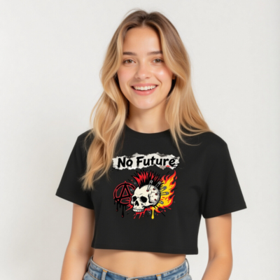 Women’s black cropped top featuring a bold ‘No Future’ graphic: mohawk skull pierced with safety pins, fiery explosion, and red anarchy symbol. Designed for punk, riot grrrl, and rebellious style. Short hem fits high-waisted bottoms. Made with standard cotton blend—no certifications claimed or implied.