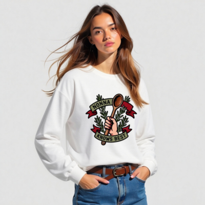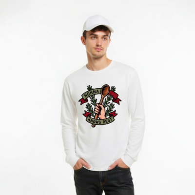 Celebrate Italian heritage with this unisex long sleeve tee featuring a hand holding a wooden spoon amid rosemary sprigs, framed by ribbons reading ‘NONNA’ and ‘KNOWS BEST’. Ideal for cooking lovers and family tradition enthusiasts. Soft cotton blend, comfortable fit, machine washable. Perfect gift for nonnas, chefs, or anyone who believes home-cooked meals are the best.