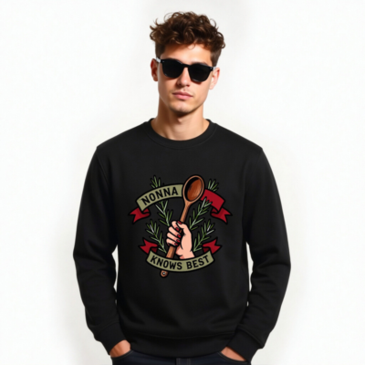 Handcrafted unisex organic sweatshirt featuring ‘Nonna Knows Best’ design with wooden spoon, rosemary, and vintage ribbon. Made from 100% certified organic cotton, this sustainable piece supports ethical production. Ideal for everyday comfort and meaningful style—celebrate heritage, sustainability, and timeless kitchen wisdom.