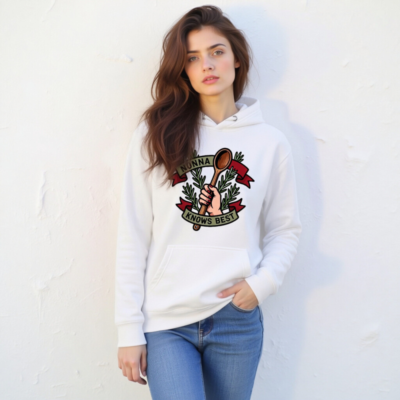 Celebrate Italian culinary heritage with this premium unisex pullover hoodie. Featuring a bold ‘Nonna Knows Best’ emblem—hand holding a wooden spoon amid rosemary sprigs and red ribbons—this cozy, high-quality hoodie blends cultural pride with everyday comfort. Made for all who honor family recipes and home-cooked love. Soft, durable fabric, relaxed fit, perfect for gifting or self-care.