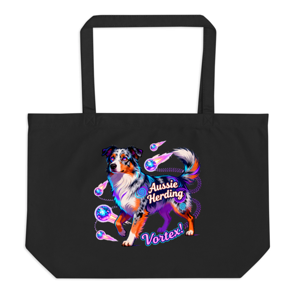 A vibrant, large black organic tote bag featuring a psychedelic Australian Shepherd in motion with ‘Aussie Herding Vortex!’ text. Made from certified organic cotton (as per product specifications), this eco-friendly canvas bag combines bold pet art with sustainable design—perfect for dog lovers seeking stylish, planet-conscious accessories.