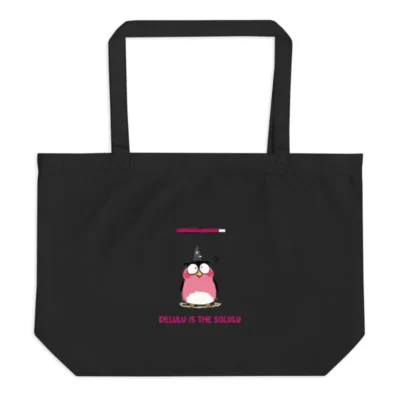 A large, black organic cotton tote bag featuring a whimsical pink owl wizard (Delulu) with a hat and wand—’DELULU IS THE SOLULU’ printed below. Made from certified organic cotton for durability and eco-conscious use. Lightweight, reusable, and stylish for everyday carry. Ideal for shoppers seeking sustainable fashion with playful charm.