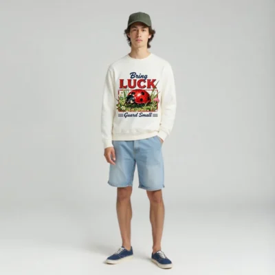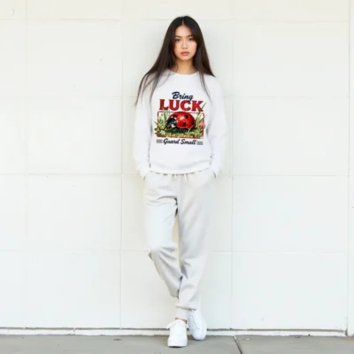 This unisex organic cotton sweatshirt features a charming vintage-style ladybug graphic with the uplifting phrase ‘Bring Luck, Guard Small’. Made from soft, eco-friendly GOTS-certified organic cotton, it offers comfort and sustainability. Perfect for casual wear, gifting, or adding a touch of whimsy to your wardrobe. The classic crewneck design suits all genders and seasons. Ethically produced with low-impact dyes, this sweatshirt combines playful artistry with conscious fashion—ideal for nature lovers and those who appreciate meaningful, minimalist design.