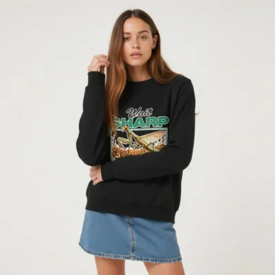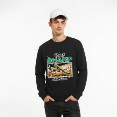 Eco-friendly unisex sweatshirt made from 100% organic cotton, featuring a bold ‘Wait Sharp, Strike Clean’ praying mantis design. Perfect for nature lovers and sustainable fashion fans. Soft, durable, and ethically produced—ideal for casual wear or gifting. The vintage-inspired graphic combines humor and entomology, making it a standout piece. Fair trade certified, low-impact dyes, and plastic-free packaging ensure minimal environmental footprint. Designed for comfort and style, this crewneck fits true to size and resists pilling. A thoughtful choice for conscious consumers who appreciate wit, wildlife, and responsible manufacturing.