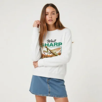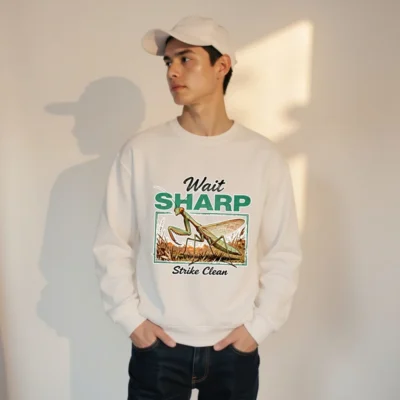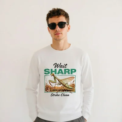 Eco-friendly unisex sweatshirt made from 100% organic cotton, featuring a vintage-style praying mantis illustration with the witty phrase ‘Wait Sharp, Strike Clean’. Soft, durable, and ethically produced—perfect for nature lovers and minimalist fashion fans. Designed for comfort and sustainability, this crewneck offers a unique blend of humor, entomology, and eco-conscious style. Ideal for casual wear, layering, or gifting. OEKO-TEX® certified dyes ensure skin-safe printing. Machine washable and pre-shrunk for lasting fit.