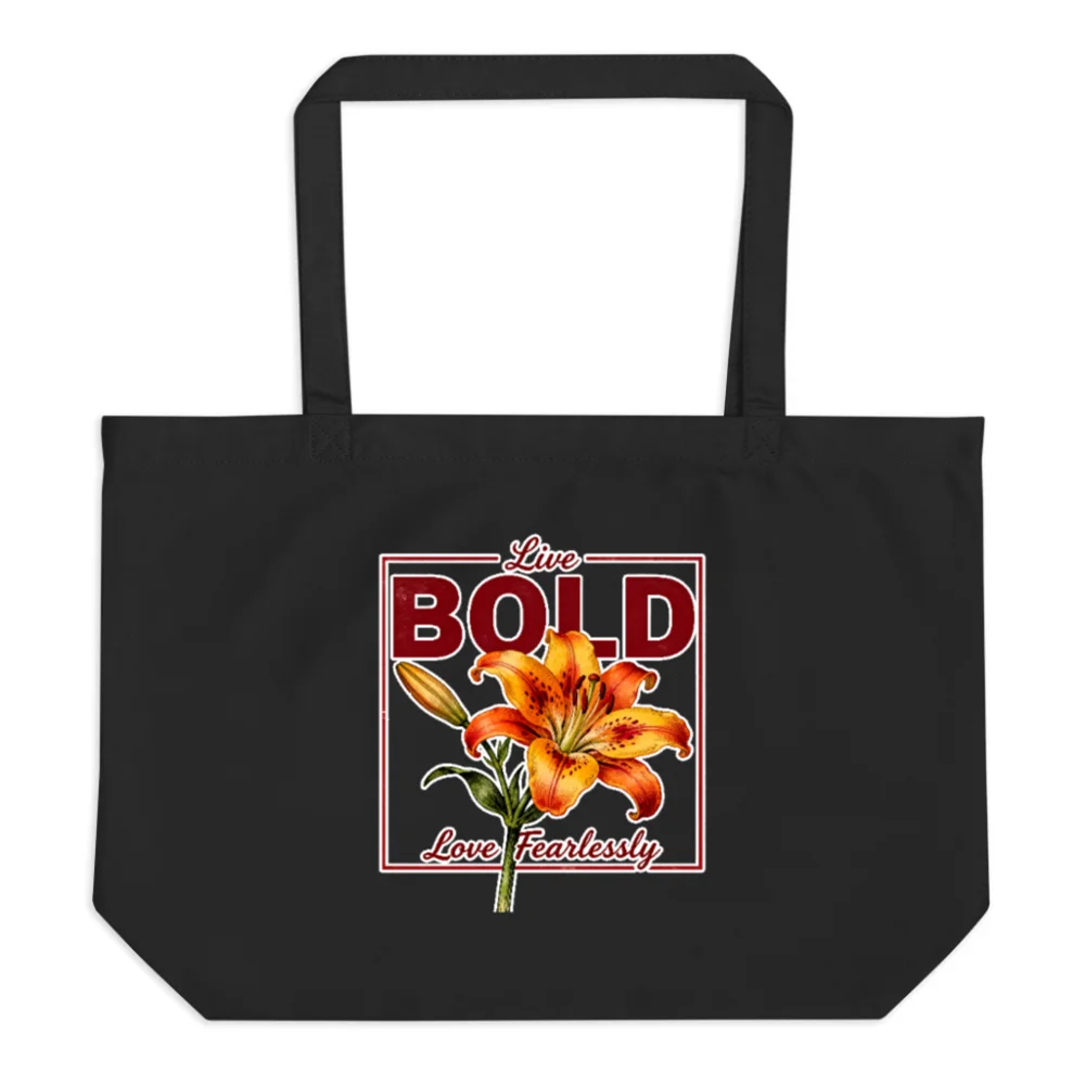 This large, eco-friendly tote bag is made from 100% certified organic cotton—durable, soft, and sustainable. Features a striking vintage-inspired print: a vibrant orange lily framed by ‘Live Bold, Love Fearlessly’ in bold typography. Perfect for groceries, books, or daily essentials. Reinforced handles support heavy loads, and the spacious design fits laptops up to 15″. Machine washable and ethically produced. A stylish, functional statement piece that blends empowerment, nature, and practicality—ideal for conscious consumers who value both aesthetics and impact.