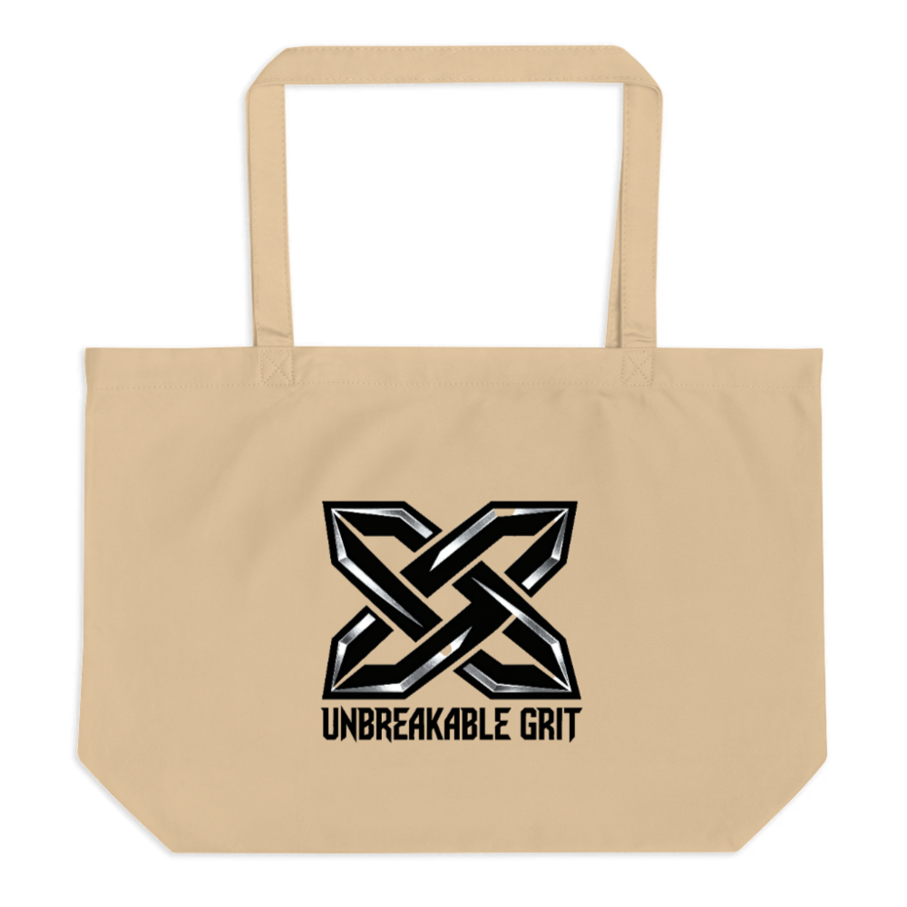 Premium large organic cotton tote bag featuring bold ‘Unbreakable Grit’ X logo with metallic accents. Designed for durability and everyday use, this eco-conscious accessory supports sustainable living. Made from certified organic cotton—no synthetic fibers or harmful chemicals. Ideal for shopping, travel, or as a statement piece. Lightweight, spacious, and machine-washable. Choose ethical style without compromise.