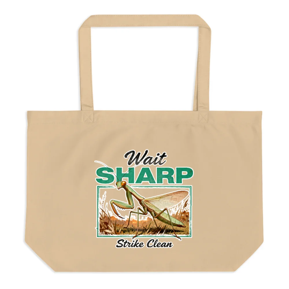 Eco-friendly large tote bag made from 100% certified organic cotton, durable and reusable for groceries, shopping, or daily carry. Features a vibrant, vintage-style praying mantis illustration with the witty phrase ‘Wait Sharp, Strike Clean’—perfect for nature lovers and sustainable fashion fans. Reinforced stitching and long handles ensure comfort and longevity. Lightweight yet sturdy, this versatile bag combines humor, entomology charm, and eco-conscious design. Ideal gift for gardeners, teachers, or anyone who appreciates clever wordplay and wildlife art.