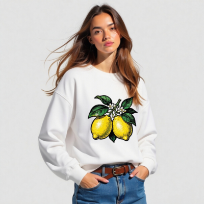 Hand-drawn lemon branch design with vibrant yellow fruits, green leaves, and white blossoms on a clean white unisex sweatshirt. Made from certified organic cotton for comfort and sustainability. Soft, breathable, and machine-washable—ideal for everyday wear. Ethically produced with no synthetic additives. Supports eco-conscious living.