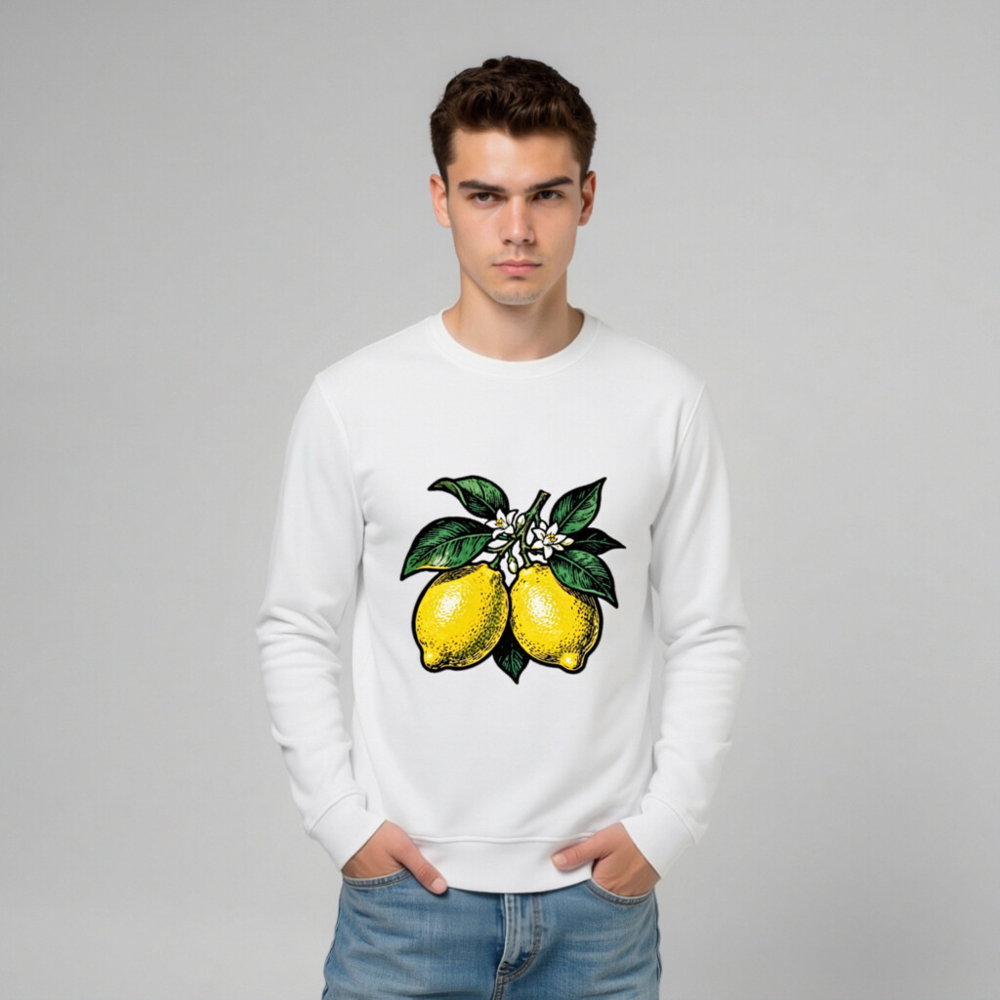 Hand-drawn lemon branch design with vibrant yellow fruits, green leaves, and white blossoms on a clean white unisex sweatshirt. Made from certified organic cotton for comfort and sustainability. Soft, breathable, and machine-washable—ideal for everyday wear. Ethically produced with no synthetic additives. Supports eco-conscious living.