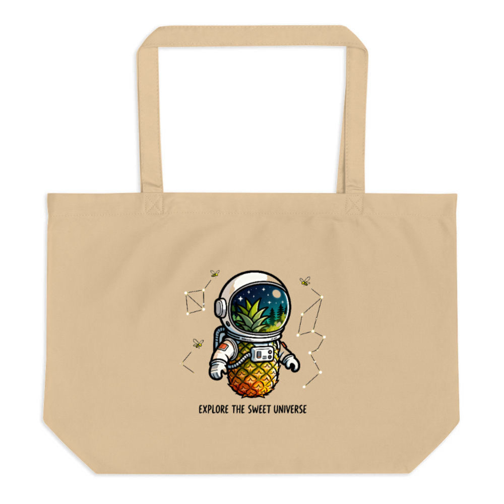 Explore the sweet universe with this large organic tote bag featuring a whimsical pineapple astronaut design—vibrant, planet-filled helmet, constellations, and buzzing bees. Made from certified organic cotton (100% GOTS-certified), it’s durable, reusable, and sustainably crafted for everyday adventures. Perfect for shopping, travel, or gifting—where eco-conscious style meets cosmic charm.