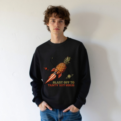 Eco-friendly unisex organic sweatshirt featuring a vibrant pineapple rocket soaring through space with planets—’Blast Off to Tasty Tasty Worlds.’ Made from certified organic cotton, this playful design blends cosmic fun with sustainable fashion. Ideal for food lovers and space enthusiasts seeking comfort and conscience. Soft, durable, and ethically crafted for everyday wear.