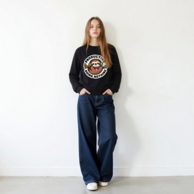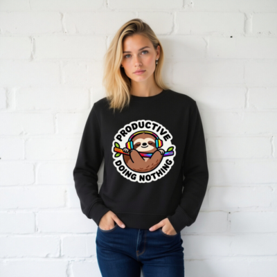 This unisex organic sweatshirt features a charming sloth wearing rainbow headphones, holding a colorful branch—perfect for relaxed productivity. Made from certified organic cotton, it’s soft, sustainable, and designed for comfort. The playful ‘Productive Doing Nothing’ slogan adds humor to your everyday wear. Ideal for eco-conscious shoppers seeking style with purpose.