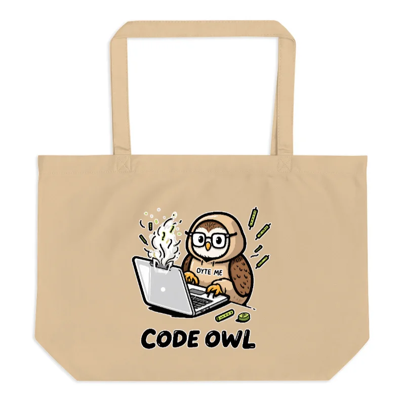 This large organic tote bag features a playful ‘Code Owl’ design—an owl with glasses typing on a steaming laptop, with ‘BYTE ME’ text and coding-themed doodles. Made from certified organic cotton, it’s a sustainable, durable everyday carryall for developers, students, and eco-conscious shoppers. Lightweight, spacious, and proudly ethically crafted for zero-waste lifestyles.
