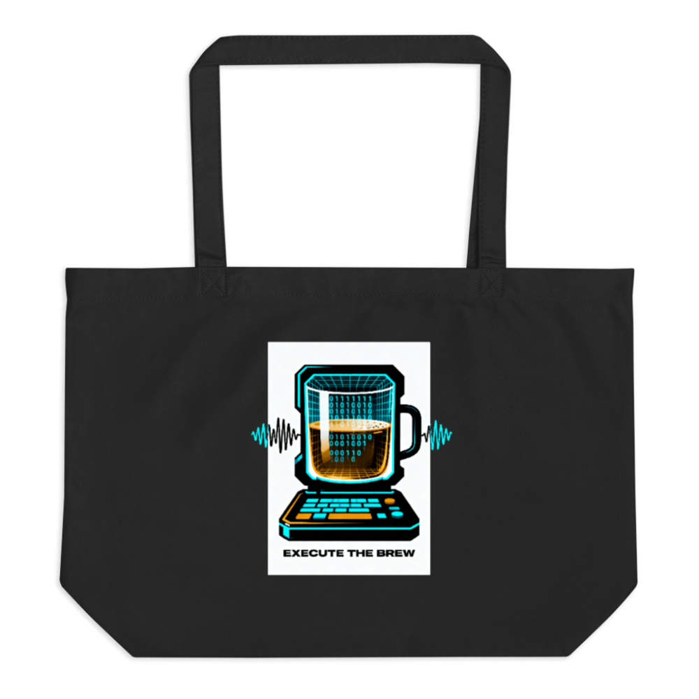 A large black organic cotton tote bag featuring a retro-futuristic design: a laptop with a coffee mug as its screen, overlaid with binary code and audio waveforms. The playful slogan ‘EXECUTE THE BREW’ ties tech culture with coffee love. Made from certified organic cotton—no synthetic additives, no harmful dyes. Sustainable, durable, and stylish for everyday use.