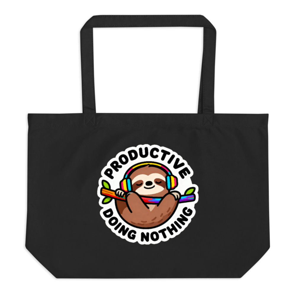 This large black organic tote bag features a charming sloth wearing rainbow headphones, holding a branch with the playful phrase ‘PRODUCTIVE DOING NOTHING’ in a circular badge. Made from certified organic cotton, it’s a sustainable, eco-friendly choice for everyday use. Durable, spacious, and stylish—perfect for shopping, work, or travel. Ideal gift for slow-living advocates and sustainability enthusiasts.