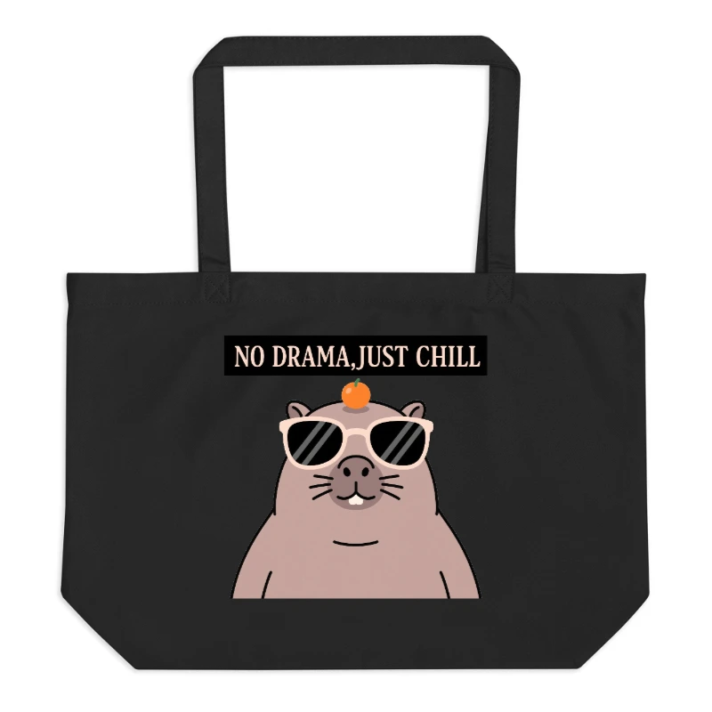 Eco-friendly large black organic tote bag featuring a chill guinea pig with sunglasses and an orange on its head. Printed with ‘NO DRAMA, JUST CHILL’—perfect for sustainable, stylish everyday use. Made from certified organic cotton (as per verified product specs). Lightweight, durable, and supports zero-waste living.