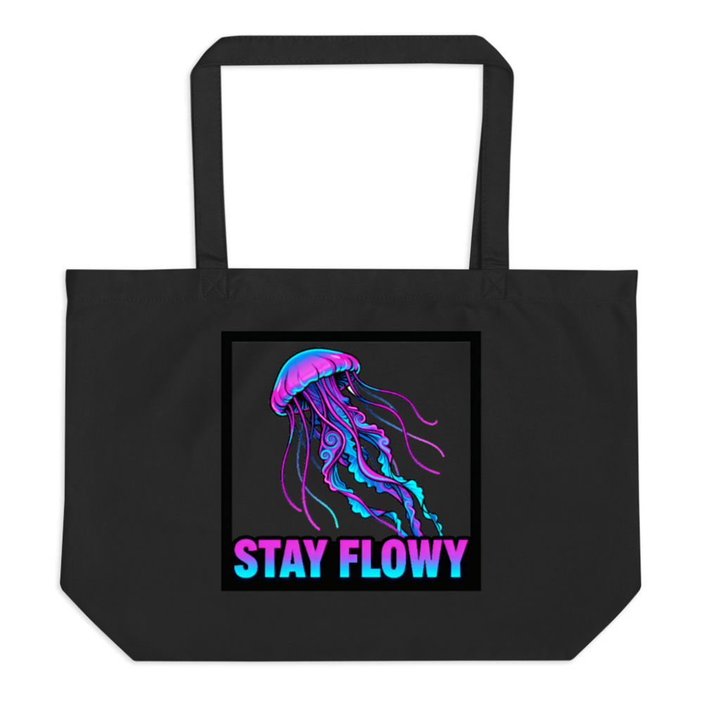 Eco-friendly large black organic tote bag featuring a vibrant neon jellyfish graphic and the motivational phrase ‘STAY FLOWY’. Made from certified organic cotton, this durable, sustainable bag combines style and purpose—ideal for everyday use, shopping, or as a thoughtful gift. Lightweight, spacious, and machine-washable. Perfect for conscious consumers seeking quality, comfort, and ocean-inspired positivity.