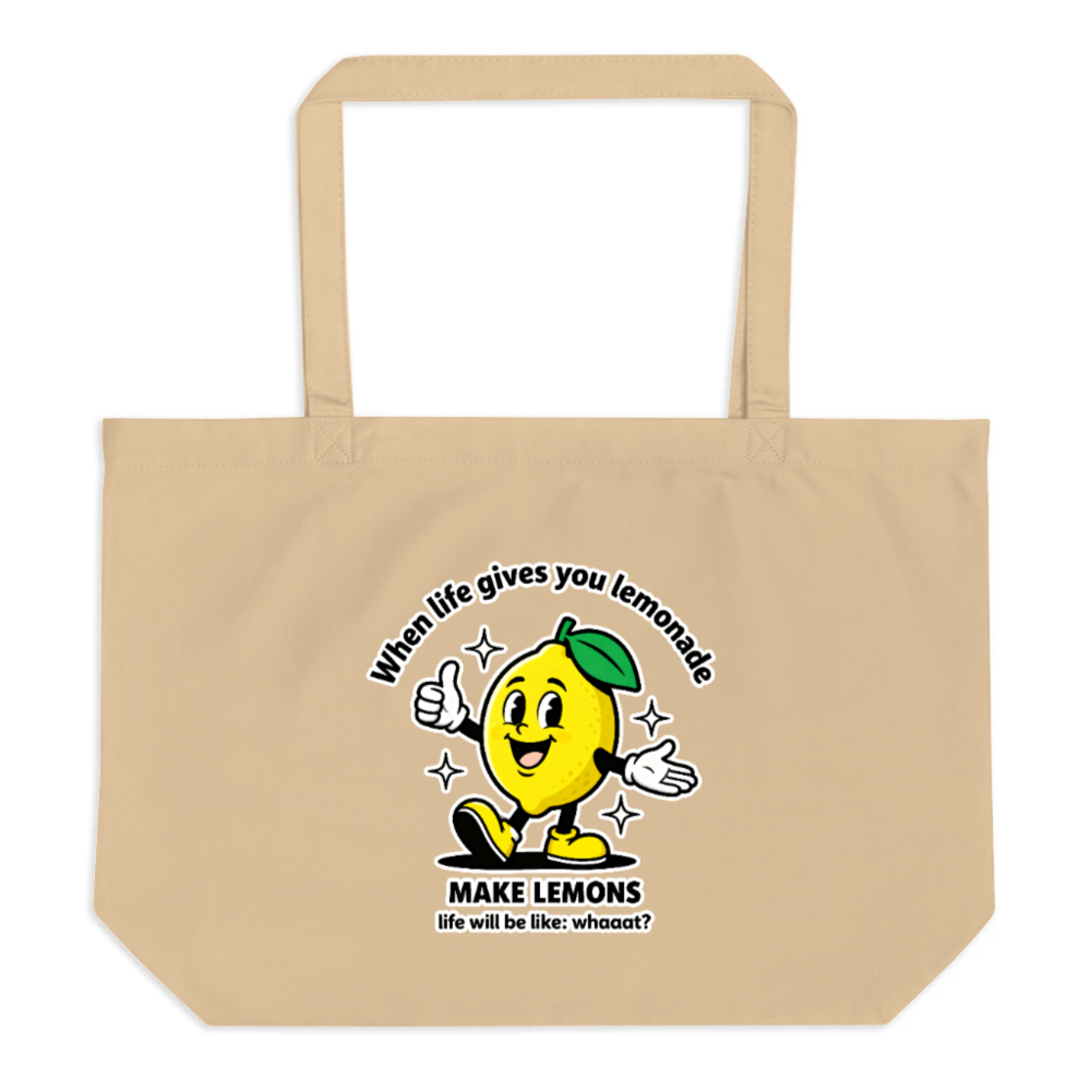 This large organic tote bag features a cheerful lemon mascot with the uplifting quote: ‘When life gives you lemonade, make lemons.’ Crafted from certified organic cotton, it’s durable, reusable, and supports eco-conscious living. The bold, playful design makes it perfect for shopping, travel, or everyday use—combining sustainability with positive vibes.