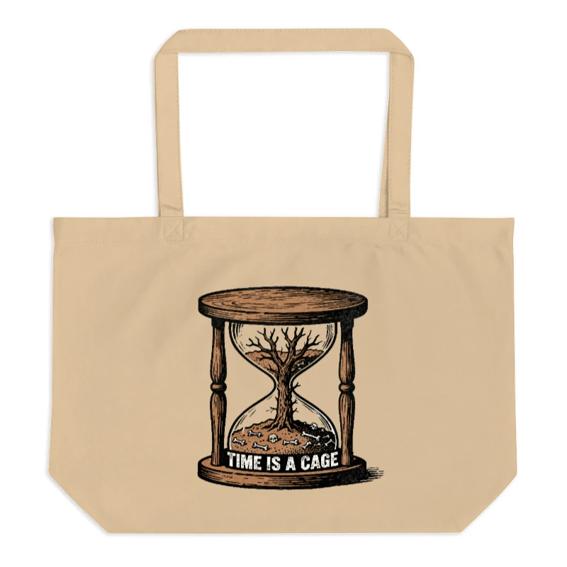 A large, eco-friendly organic tote bag featuring a striking hourglass design with a bare tree and bones—symbolizing ‘Time Is a Cage.’ Made from sustainable cotton, this durable canvas bag combines bold art with conscious living. Ideal for everyday use, shopping, or as a statement piece. Lightweight, reusable, and ethically crafted for zero-waste lifestyles.