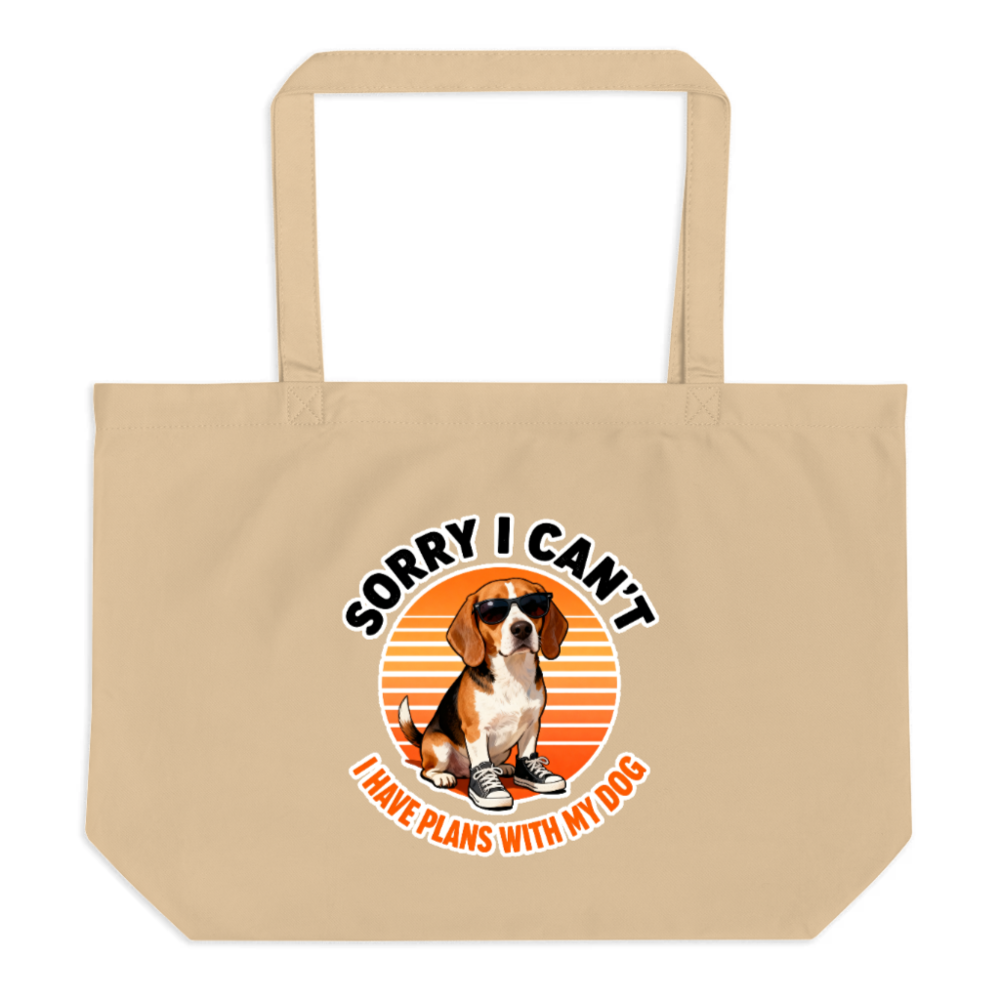 Eco-friendly large organic tote bag featuring a trendy beagle in sunglasses and sneakers against a retro sunset. Made from 100% certified organic cotton, this stylish, durable bag is perfect for shopping, travel, or everyday use. The playful ‘Sorry I Can’t, I Have Plans With My Dog’ slogan appeals to dog lovers and pet parents seeking sustainable fashion. Lightweight, spacious, and machine-washable—ideal gift for pet enthusiasts.