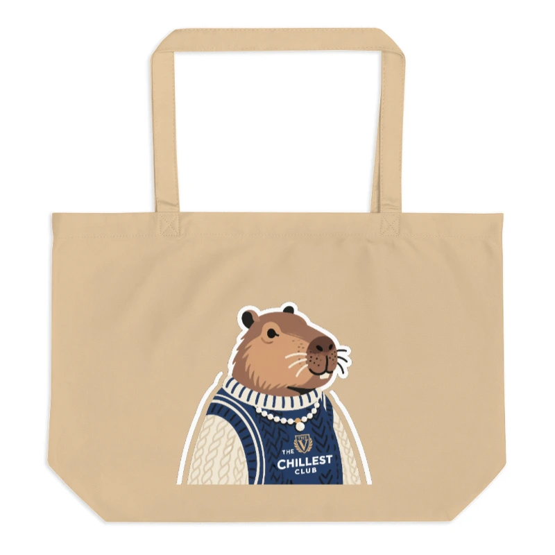 This large organic tote bag features a charming capybara illustration wearing a cozy sweater and pearl necklace, embodying relaxed sophistication. Made from certified organic cotton, it’s durable, reusable, and perfect for everyday use—reducing plastic waste while adding playful style to your routine. Ideal for shopping, work, or travel, this eco-conscious accessory supports sustainable living without compromising on comfort or design.
