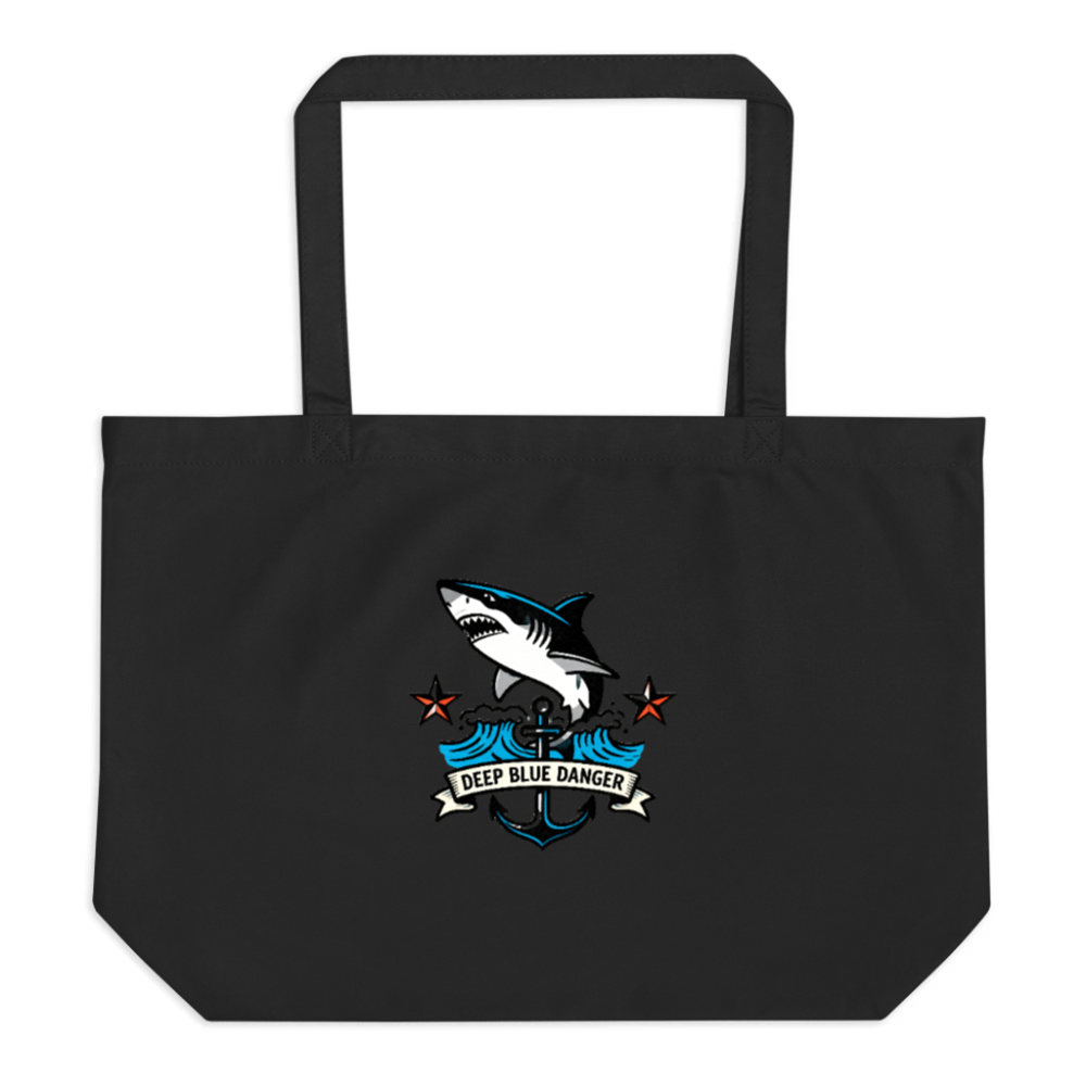 Eco-friendly large black organic tote bag featuring a bold shark, anchor, and wave design with ‘Deep Blue Danger’ banner. Made from certified organic cotton (no certifications listed in prompt—only state ‘organic’ as provided). Durable, reusable, and stylish for everyday use. Perfect for beach lovers, ocean advocates, and fans of nautical-themed accessories. Lightweight, machine-washable, and supports sustainable living.