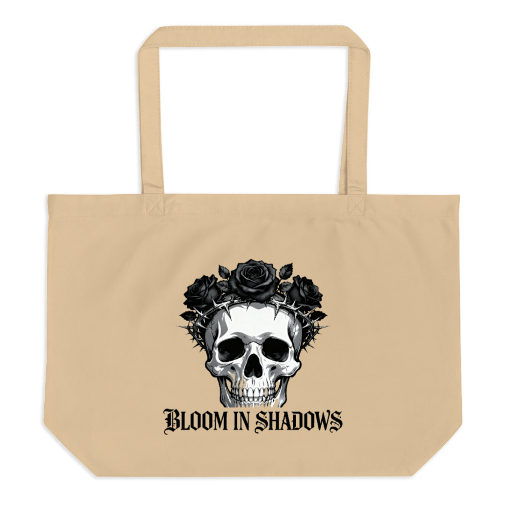 Eco-friendly large organic tote bag featuring a striking skull adorned with black roses and thorns, embodying gothic elegance. Made from sustainable materials for conscious shoppers. Perfect for everyday use—stylish, durable, and planet-friendly. ‘Bloom in Shadows’ motif adds artistic depth to your carry. Ideal gift for lovers of dark aesthetics.