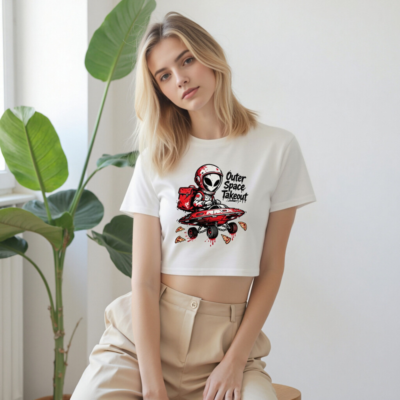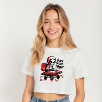 A playful, high-contrast women’s crop top featuring a red-and-white alien astronaut delivering pizza in a UFO with wheels. The bold graphic includes splattered pizza slices and dripping sauce for a fun, edgy vibe. Perfect for space fans, pizza lovers, and casual wear. Made from soft, comfortable fabric—ideal for everyday style.
