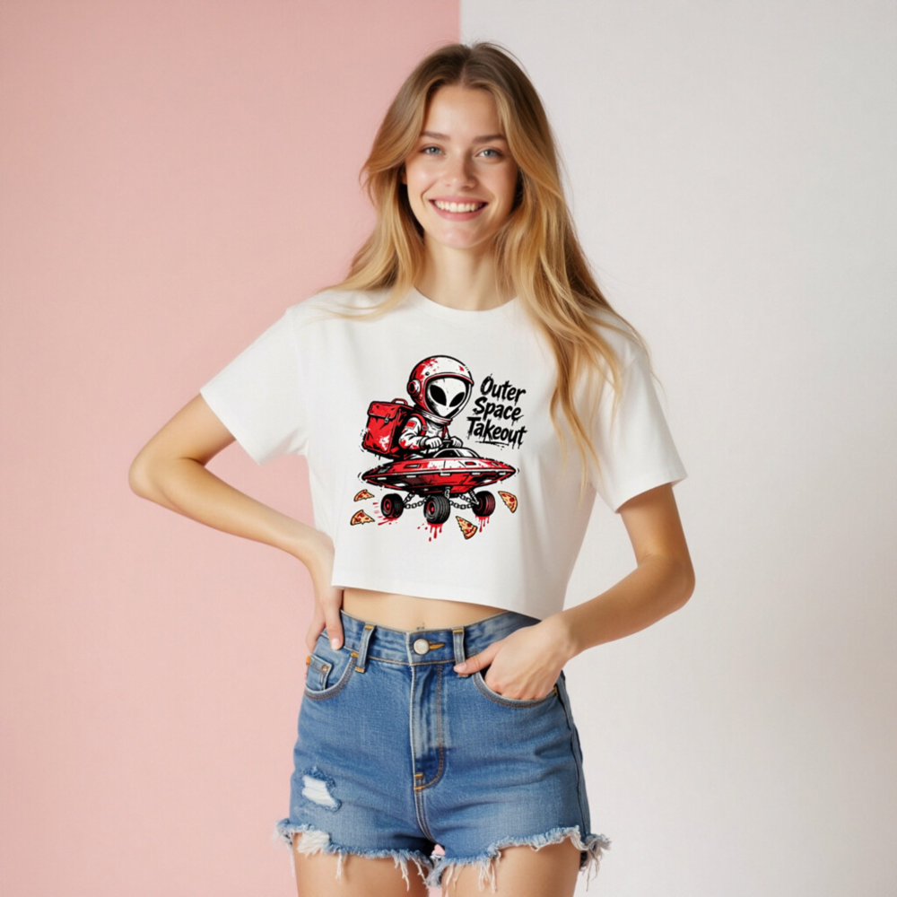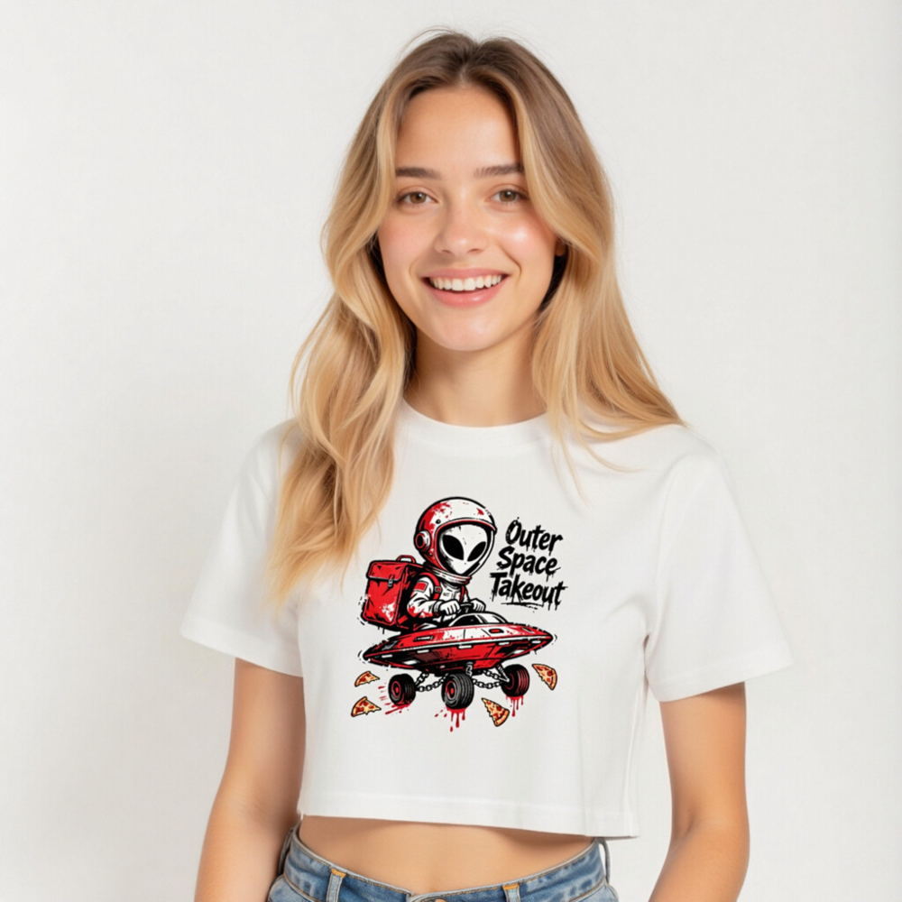 A playful, high-contrast women’s crop top featuring a red-and-white alien astronaut delivering pizza in a UFO with wheels. The bold graphic includes splattered pizza slices and dripping sauce for a fun, edgy vibe. Perfect for space fans, pizza lovers, and casual wear. Made from soft, comfortable fabric—ideal for everyday style.
