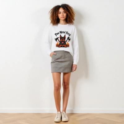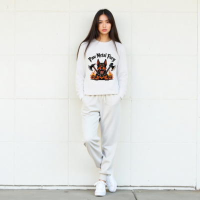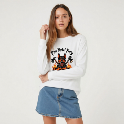Unisex long sleeve tee featuring a fierce Doberman graphic with crossed axes, guitar, flames, and paw prints. Bold ‘Paw Metal Fury’ gothic text above. Designed for rock/metal fans and dog lovers—high-quality cotton blend, comfortable fit, unisex sizing. Perfect for concerts, festivals, or everyday edgy style.