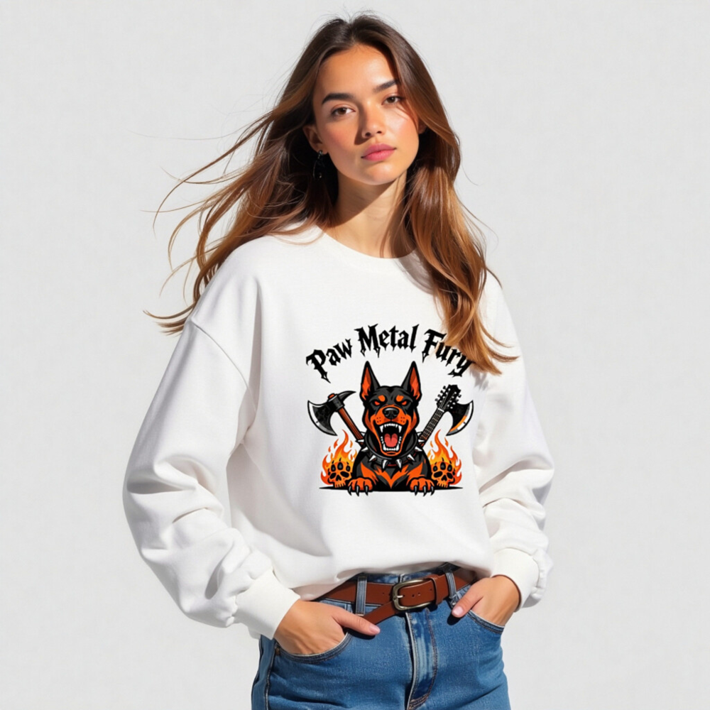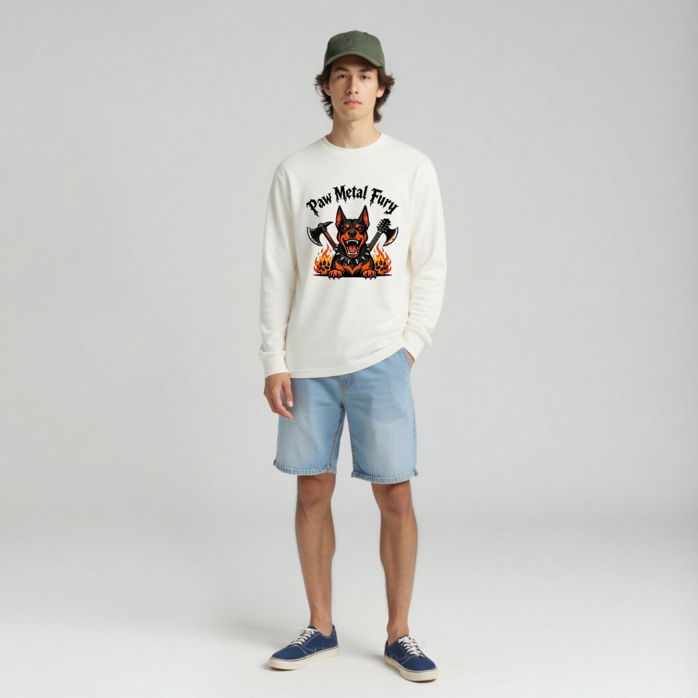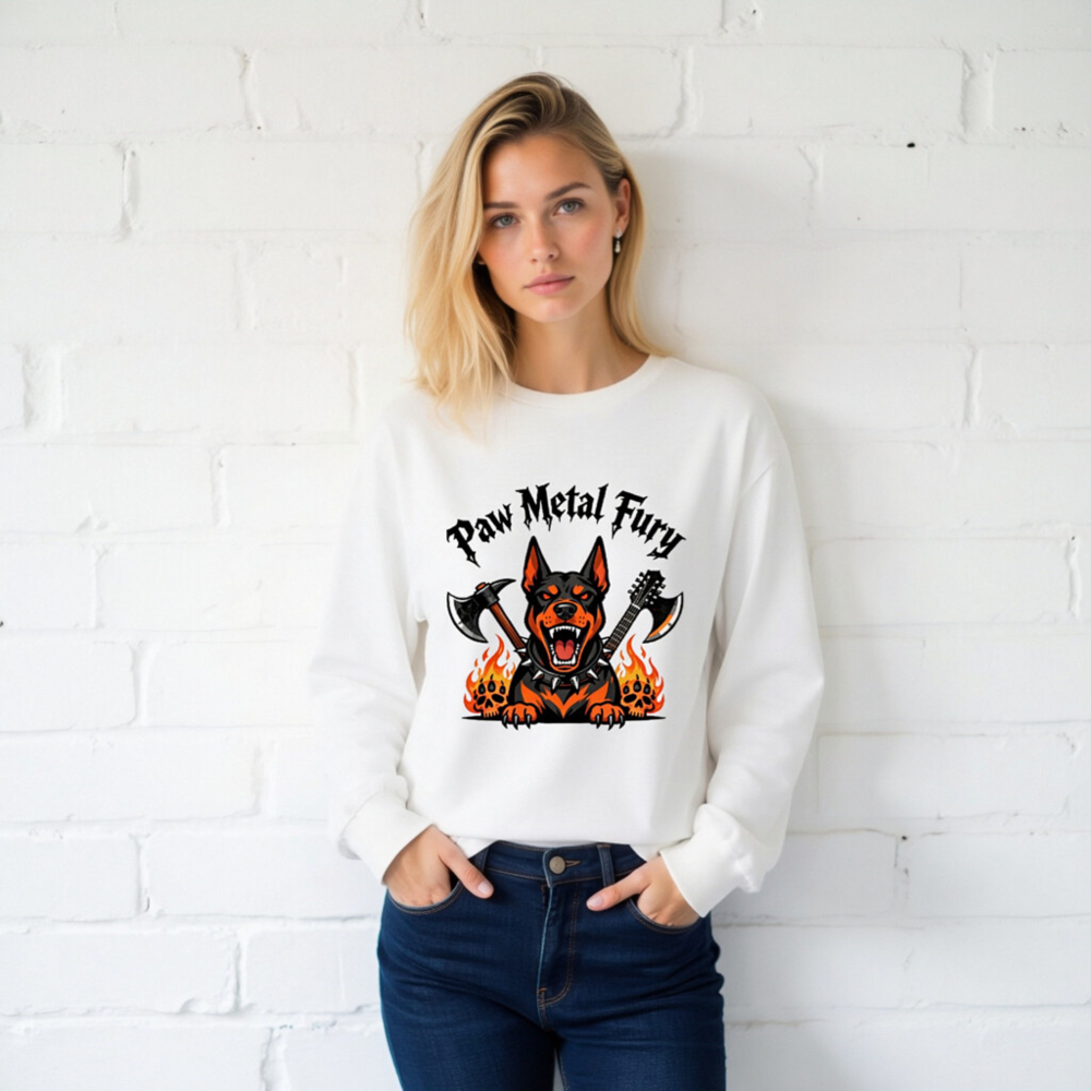 Unisex long sleeve tee featuring a fierce Doberman graphic with crossed axes, guitar, flames, and paw prints. Bold ‘Paw Metal Fury’ gothic text above. Designed for rock/metal fans and dog lovers—high-quality cotton blend, comfortable fit, unisex sizing. Perfect for concerts, festivals, or everyday edgy style.