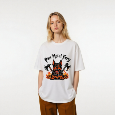 Unisex organic cotton t-shirt featuring a fierce Doberman graphic with axes, guitar, flames, and skulls. ‘Paw Metal Fury’ bold gothic text. Premium soft, eco-friendly fabric. Designed for metal fans who love bold, high-contrast prints. Comfortable fit for everyday wear. Made with certified organic cotton—no synthetic additives.