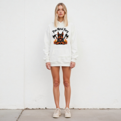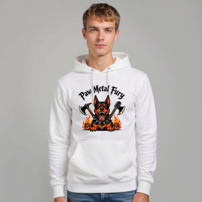 Unisex premium pullover hoodie featuring bold ‘Paw Metal Fury’ graphic: a fierce Doberman with glowing red eyes, flanked by crossed axes and guitar, surrounded by flames and paw prints. Soft cotton blend, comfortable fit for men and women. Ideal for metal fans, pet lovers, and rock culture enthusiasts. High-quality print, durable construction, everyday wear style.