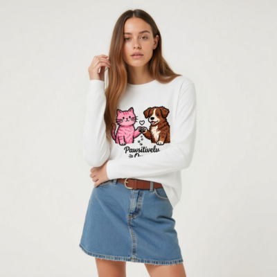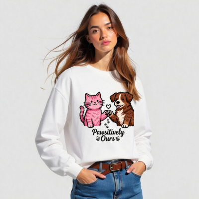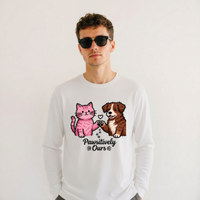 Adorable unisex long sleeve tee featuring a pink cat and brown dog holding paws with a heart and paw prints, paired with the playful phrase ‘Pawsitively Ours’. Made from comfortable, soft cotton fabric. Perfect for pet lovers seeking cozy, fun everyday wear. Ideal gift for animal enthusiasts.