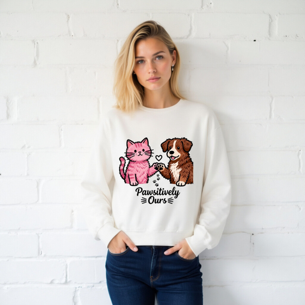 Adorable unisex long sleeve tee featuring a pink cat and brown dog holding paws with a heart and paw prints, paired with the playful phrase ‘Pawsitively Ours’. Made from comfortable, soft cotton fabric. Perfect for pet lovers seeking cozy, fun everyday wear. Ideal gift for animal enthusiasts.