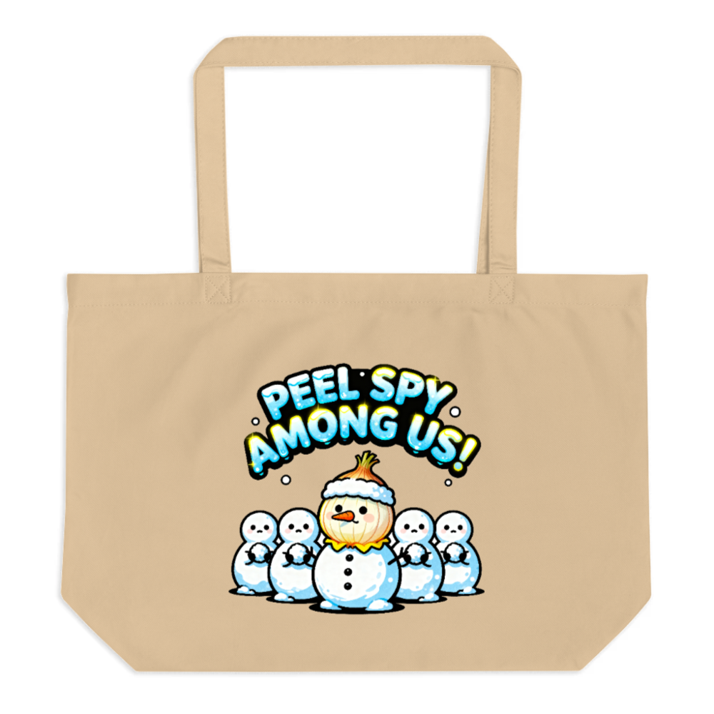 A large, organic cotton tote bag featuring the ‘Peel Spy Among Us!’ design — a playful snowman with an onion head surrounded by innocent-looking snowmen. Made from certified organic cotton, this reusable bag is eco-friendly, durable, and perfect for shopping, commuting, or gifting. Ideal for sustainability advocates who love quirky, seasonal humor.