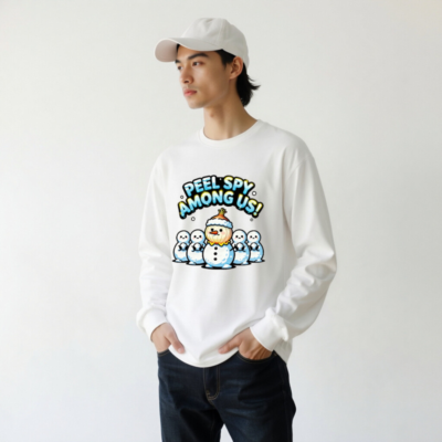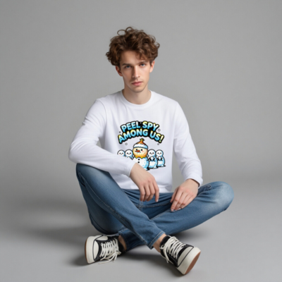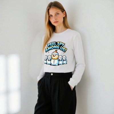 This unisex long sleeve tee features a hilarious ‘Peel Spy Among Us!’ design: a snowman with an onion head stands among four plain snowmen, perfect for winter fans and Among Us enthusiasts. The playful graphic combines seasonal charm with pop culture humor. Made from comfortable cotton blend, it’s ideal for casual wear, holidays, or themed events. Available in standard unisex sizing.