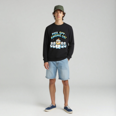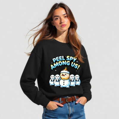 A playful unisex organic sweatshirt featuring a ‘Peel Spy Among Us!’ design with a snowman wearing an onion hat among five plain snowmen. Made from certified organic cotton, this eco-conscious garment combines holiday humor with sustainable fashion. Ideal for cozy winter wear and fun gift-giving. Soft, comfortable, and responsibly crafted.