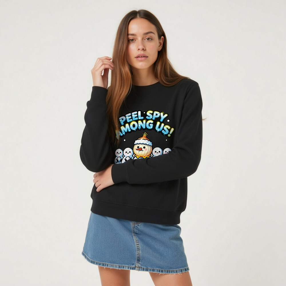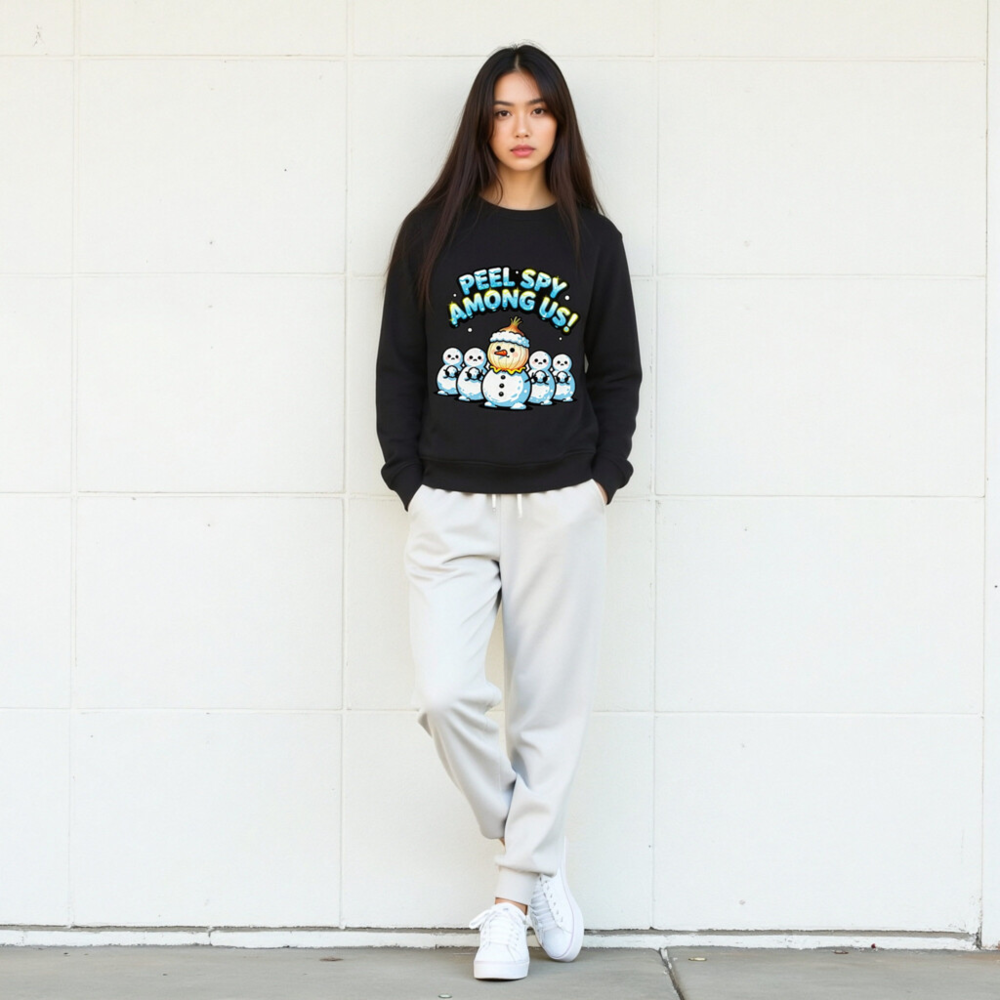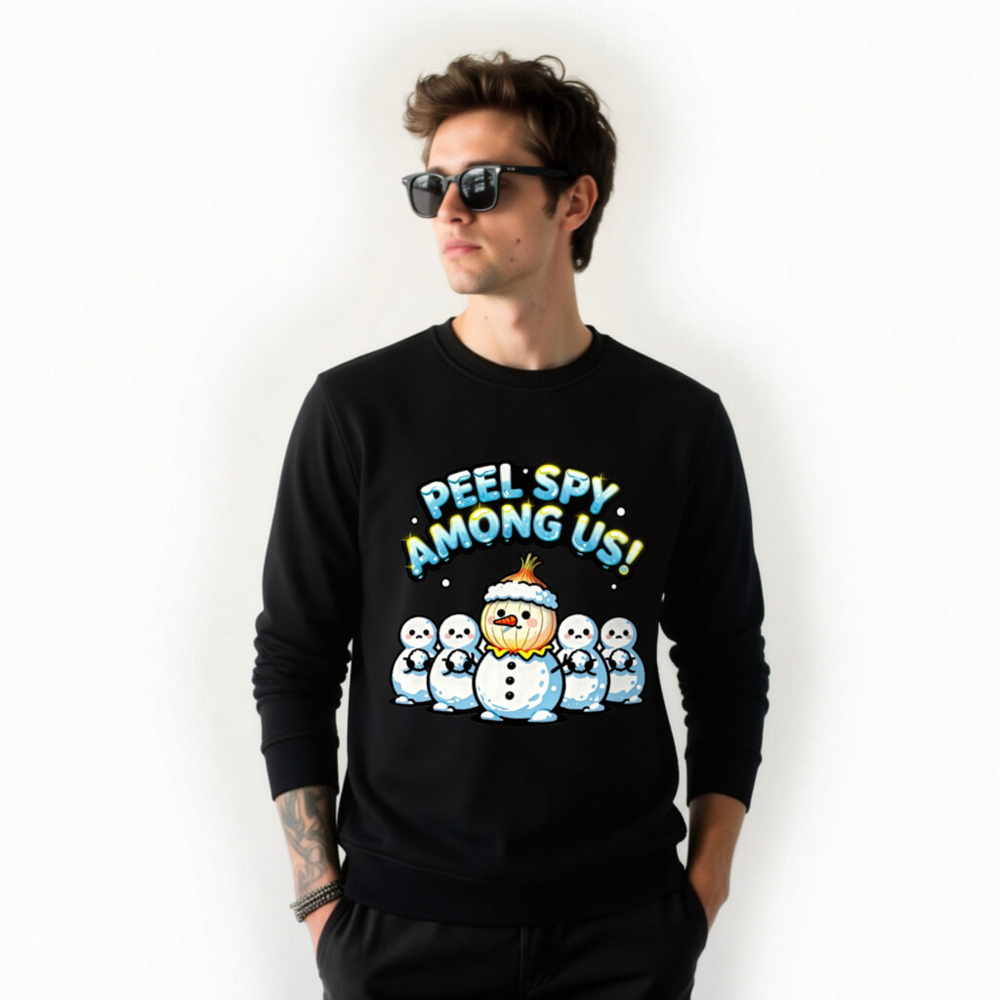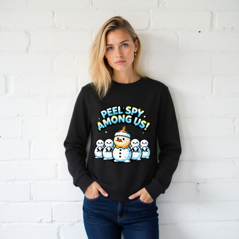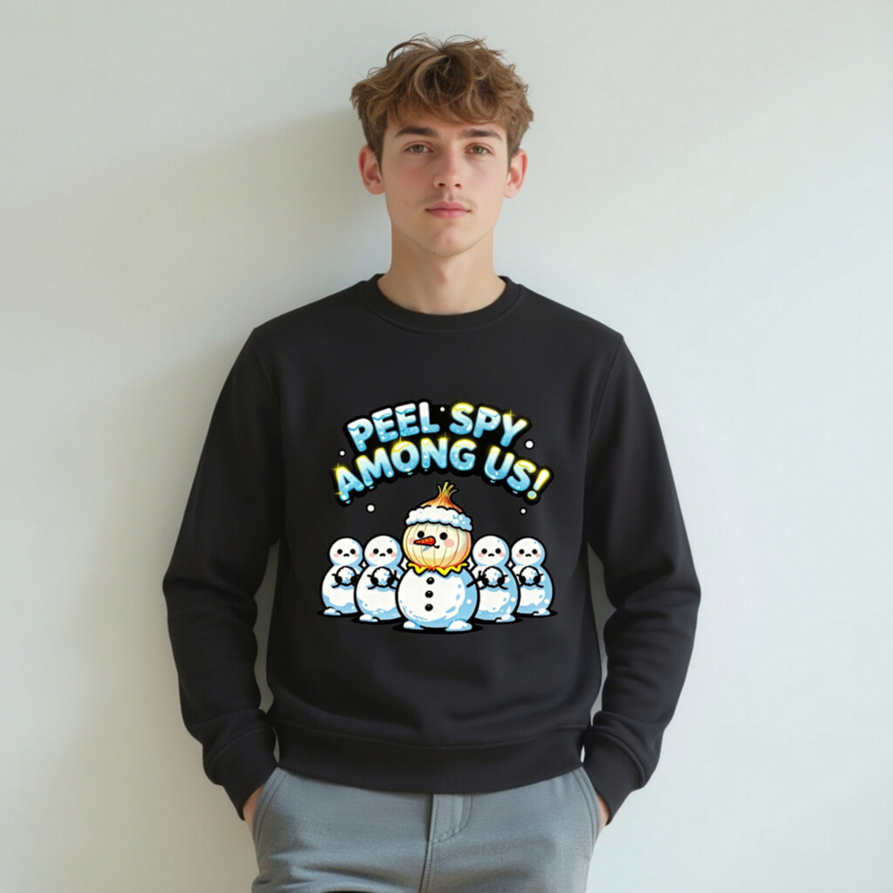 A playful unisex organic sweatshirt featuring a ‘Peel Spy Among Us!’ design with a snowman wearing an onion hat among five plain snowmen. Made from certified organic cotton, this eco-conscious garment combines holiday humor with sustainable fashion. Ideal for cozy winter wear and fun gift-giving. Soft, comfortable, and responsibly crafted.