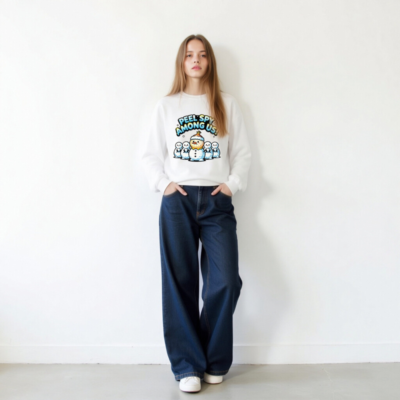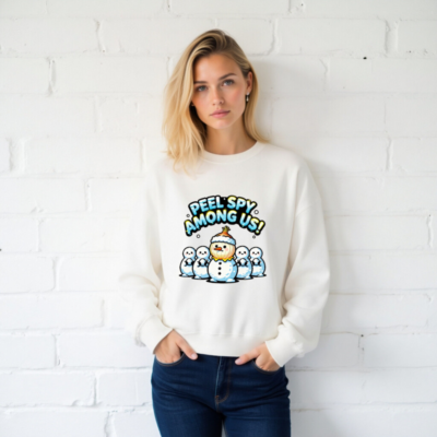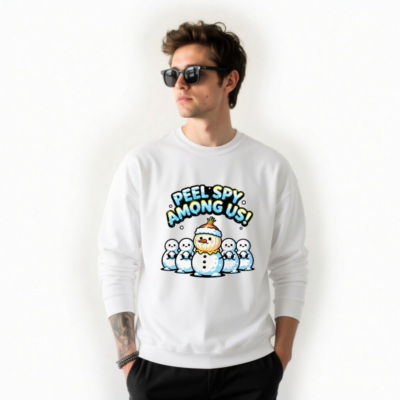 A playful unisex crew neck sweatshirt featuring a ‘Peel Spy Among Us!’ design with a snowman wearing an onion as a hat, surrounded by four plain snowmen. Perfect for winter fans and Among Us enthusiasts. Soft, comfortable cotton blend. Ideal for casual wear or holiday gifting. Available in all sizes.