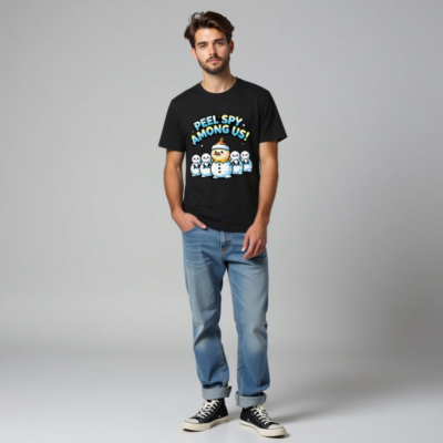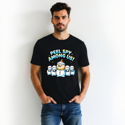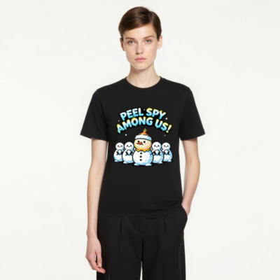 Cute ‘Peel Spy Among Us!’ snowman design with onion-headed spy among five plain snowmen—funny holiday twist on the popular game. Unisex staple t-shirt, soft cotton blend, great for Christmas, winter, or geeky fans. Perfect gift for gamers & foodies. Available in all sizes.